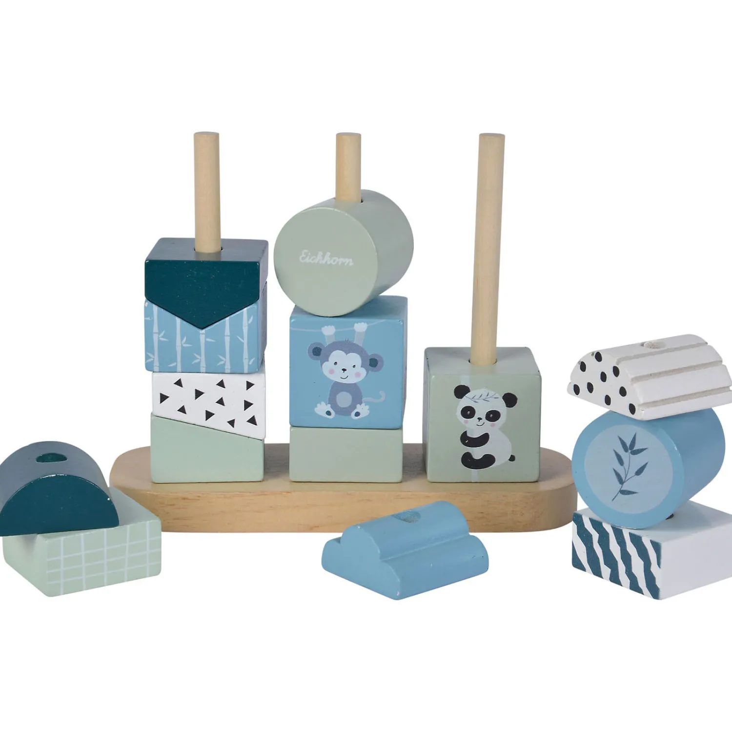 Mooi houten stapel- en sorteerspeel van Eichhorn. Het stapelspel is in blauw/groene tinten en heeft lieve afbeeldingen van het Eichhorn-pandabeertje en aapje. Stapel de verschillende vormen blokken op elkaar en observeer hoe de vormen op elkaar aansluiten. Dit spel is goed voor de ontwikkeling van hand-oogcoördinatie en de fijne motoriek. Gemaakt van hoogwaardig berkenhout en geschikt voor kinderen vanaf 12 maanden.
