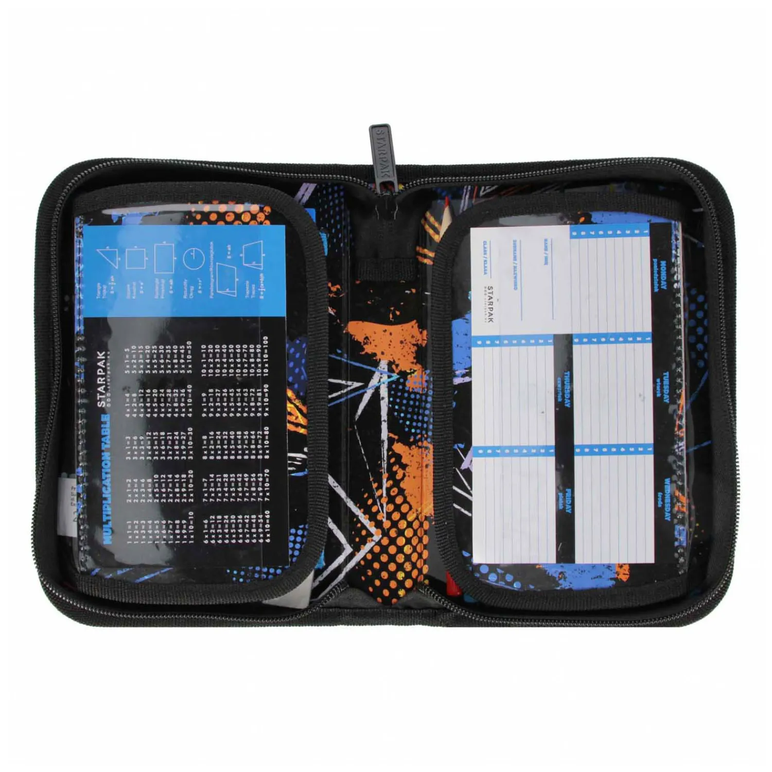 Het etui is zwart met blauw en heeft een coole print met voetballen. In het etui zitten gekleurde viltstiften, een grijs potlood, een gum, liniaal en puntenslijper, en 10 kleurpotloden. In de transparante insteekvakken zit een weekplanner en een rekenkundig vermenigvuldigingstabel.