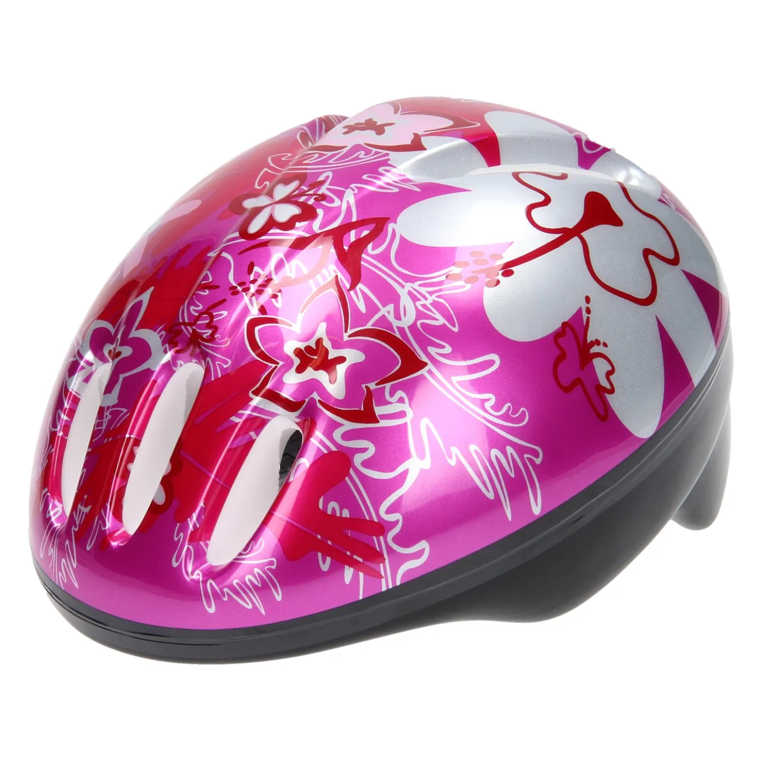 De kinderhelm is voorzien van een roze en zilveren bloemenprint.