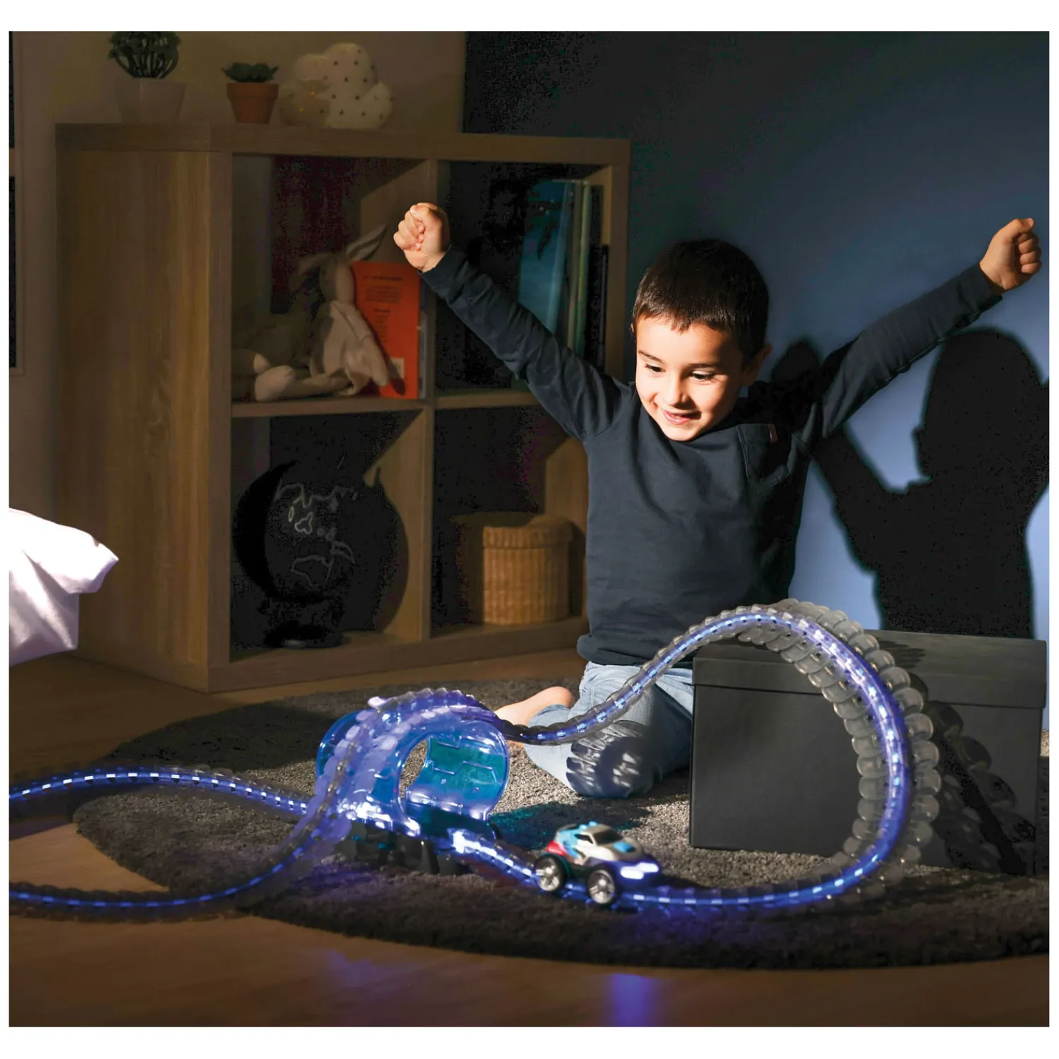 Maak een looping, leg de baan op z’n kop of steek ‘m zo over van de tafel naar de stoel. Niks is te gek met de Smoby FleXtreme Neon Set! Deze 112-delige raceset bestaat uit maar liefst 2,6 meter aan baan met lichtvezels, een verlichte tunnel en elektrische auto met verlichting. Er zijn verschillende standen en maar liefst 7 kleuropties voor het verlichten van deze vette raceset. In het donker zie je een waar lichtspektakel als de auto over de baan racet.