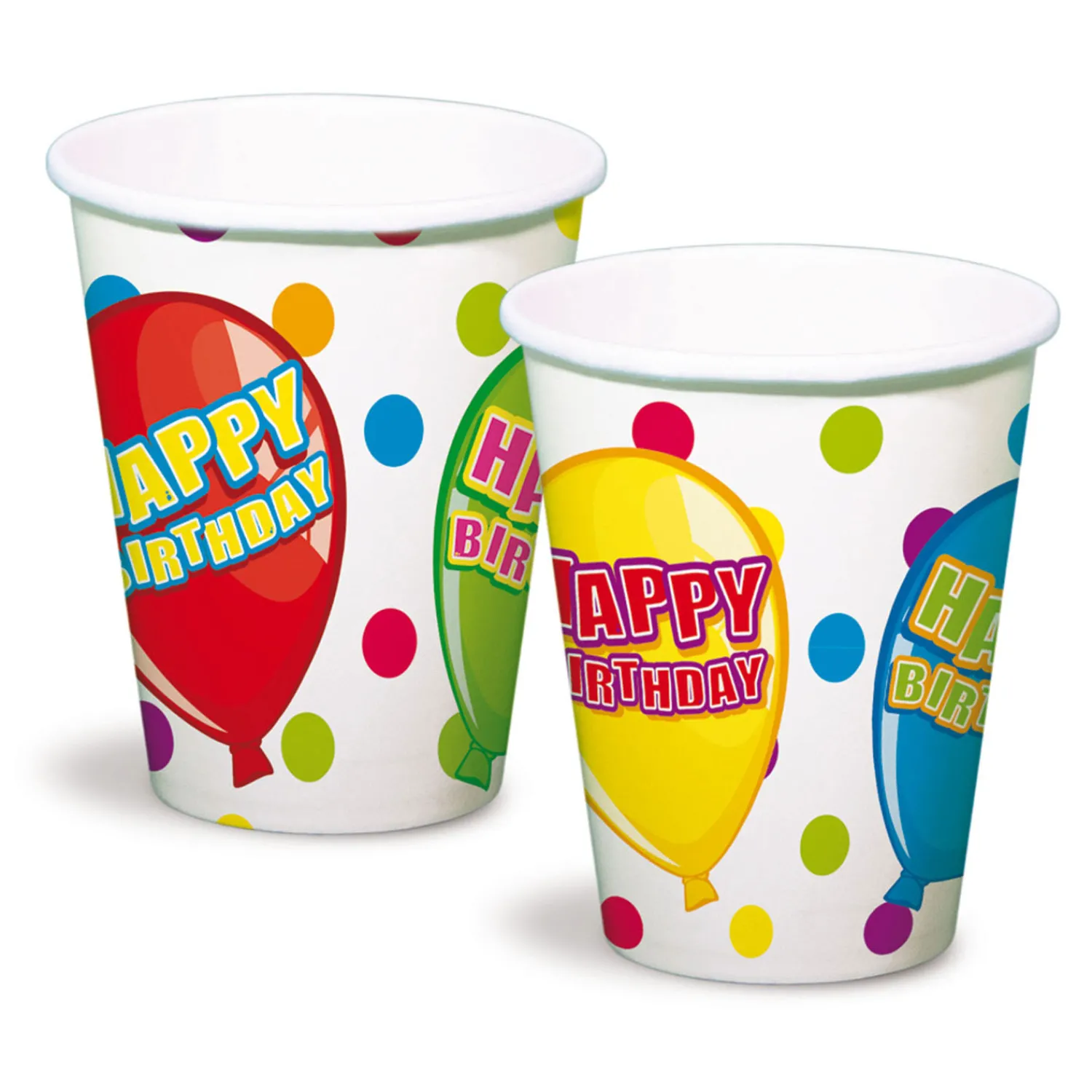 Set van 6 gekleurde feestbekers met de tekst happy birthday. De bekers zijn gemaakt van karton en er kan een inhoud in van 250 ml.