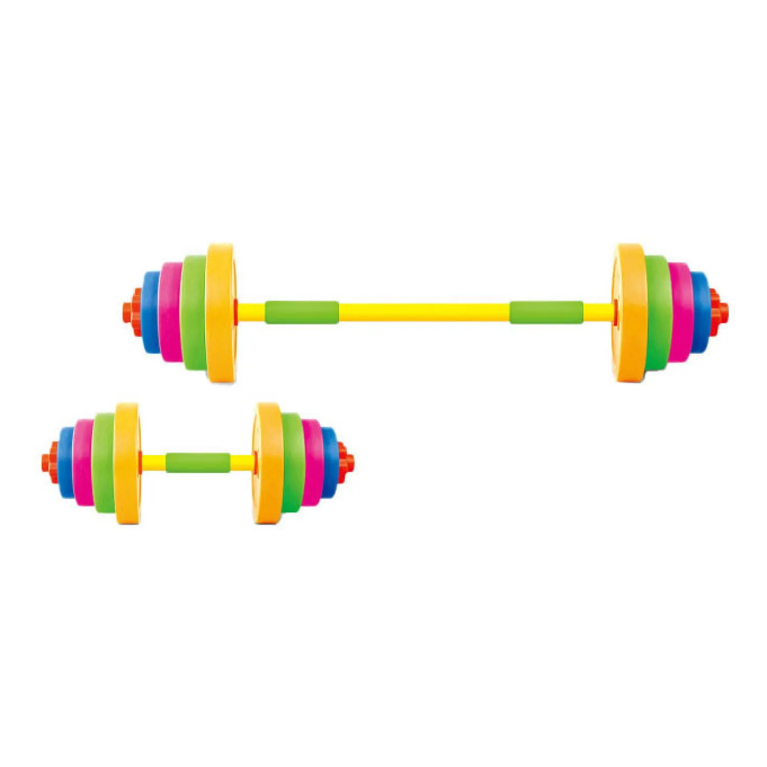 De set bestaat uit 2 verschillende stangen (80 en 46 centimeter lang), 4 klemmen, 16 schijven (4x 800 ml, 4x 520 ml, 4x 330 ml en 4x 200 ml). Geschikt voor kinderen vanaf 3 jaar.