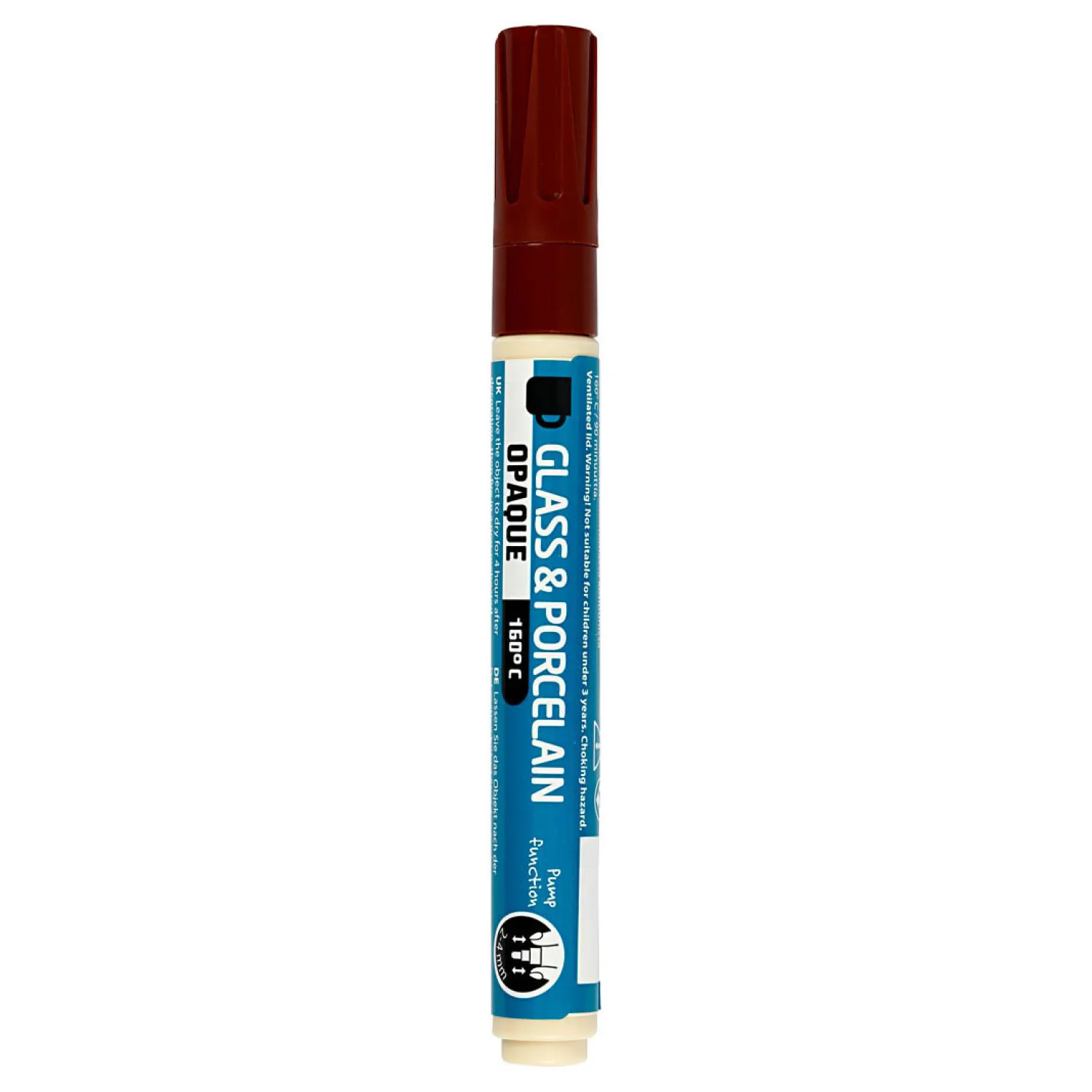 Dekkende glas- en porseleinstift op waterbasis geschikt voor zowel glas, porselein, metaal als donker keramiek.Na 4 uur drogen af te bakken in een oven gedurende 90 min op 160C – na afbakken vaatwasmachine bestendig.