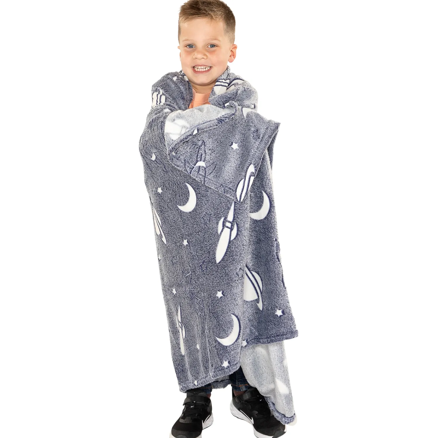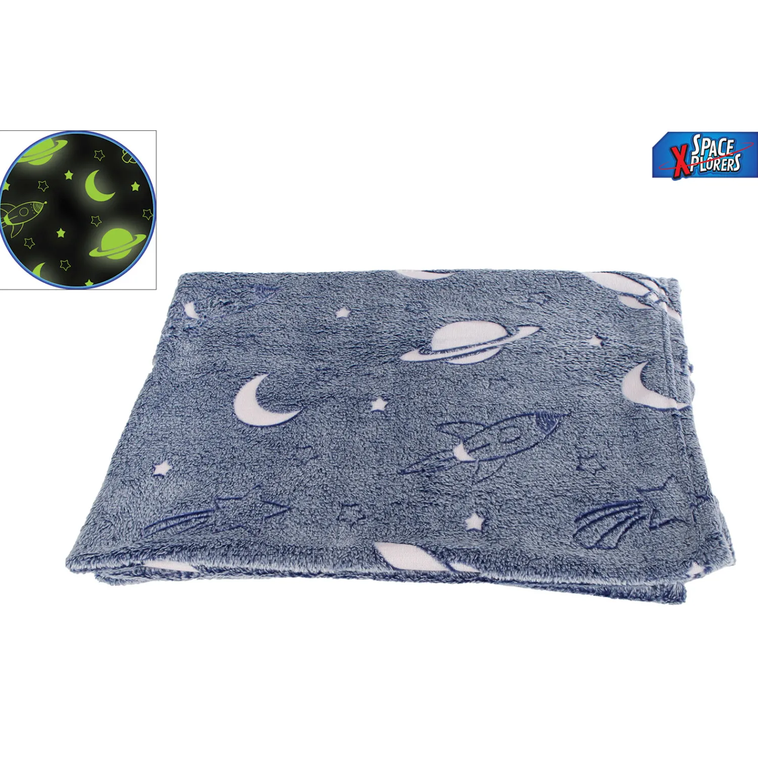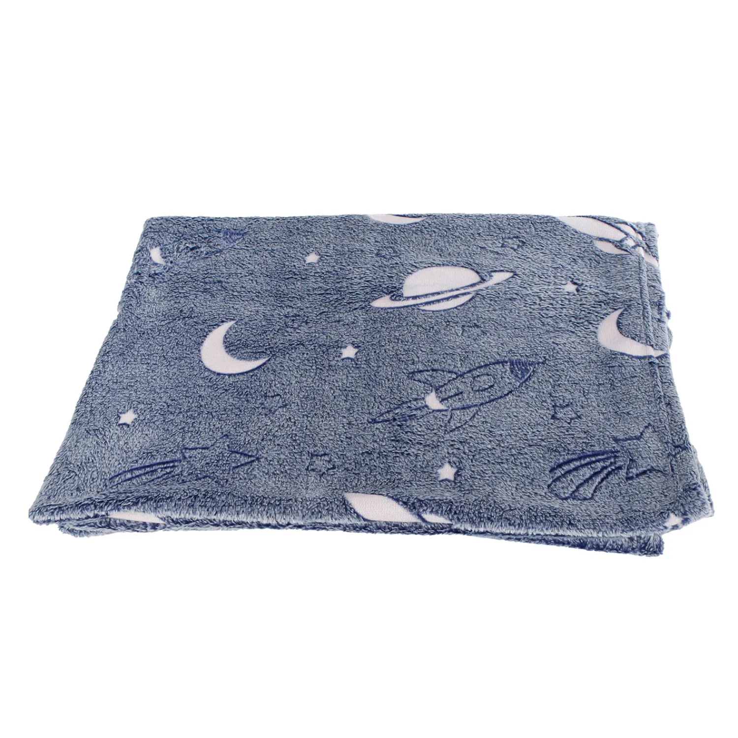 Heerlijk zachte en warme ruimtedeken van 100 x 150 centimeter groot. De deken is donkerblauw en bedrukt met witte planeten, die in het donker oplichten dankzij het glow-in-the-dark effect. Een heerlijk knuffelig cadeau voor ruimtefans!