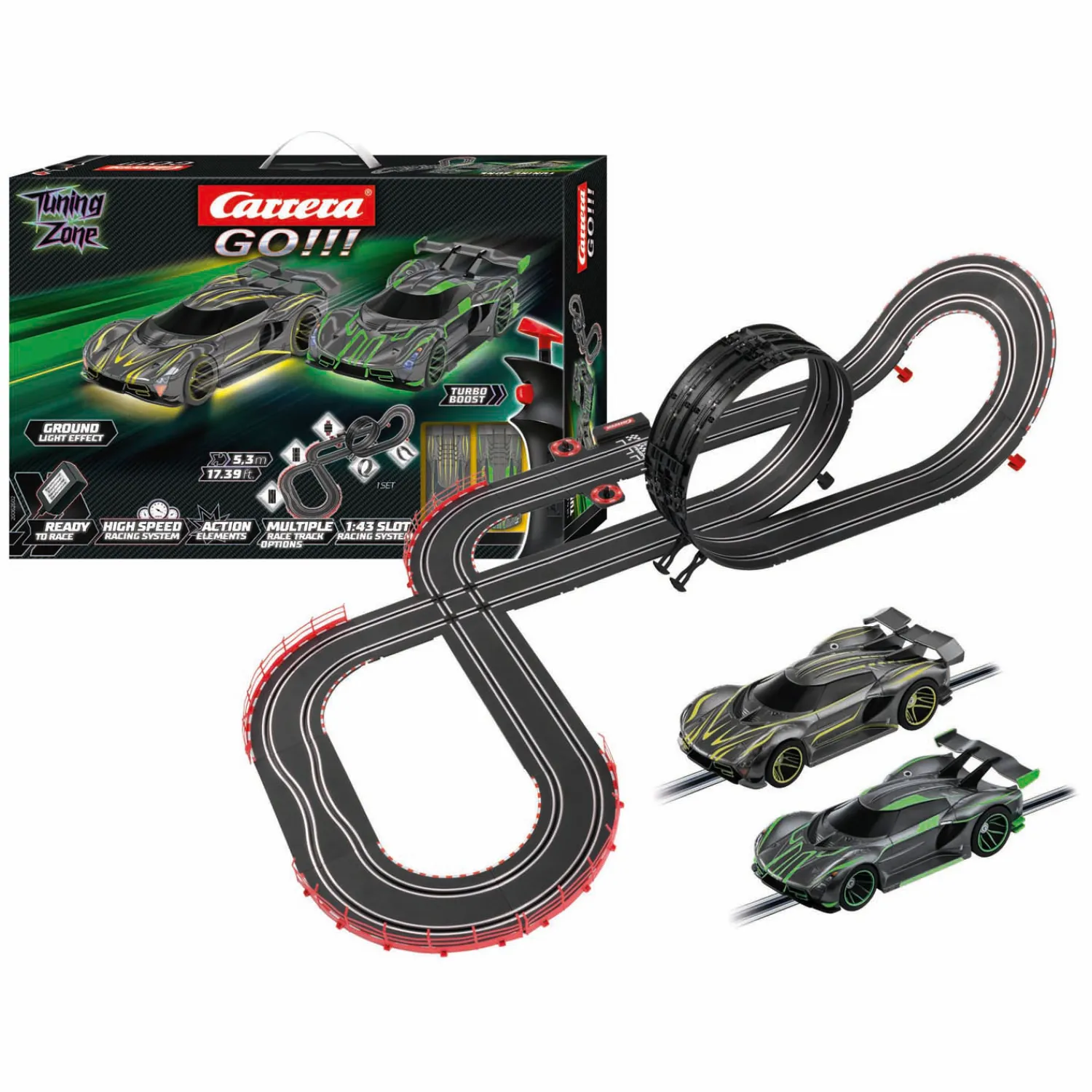 De Carrera GO!!! Tuning Zone”-set combineert spannende races met creatieve mogelijkheden. De 1:43 schaal hypercars maken indruk met een futuristisch design dat doet denken aan de esthetiek van moderne auto’s van de toekomst. Door hun dynamische vorm en stijlvolle details zijn het echte blikvangers en een hoogtepunt in de Carrera-wereld. Het 5,3 meter lange circuit biedt veel afwisseling en spanning met elementen als loopings, een kruising en een fly-over. Nauwkeurige controle en bliksemsnelle reacties zijn vereist wanneer de hypercars op topsnelheid komen.