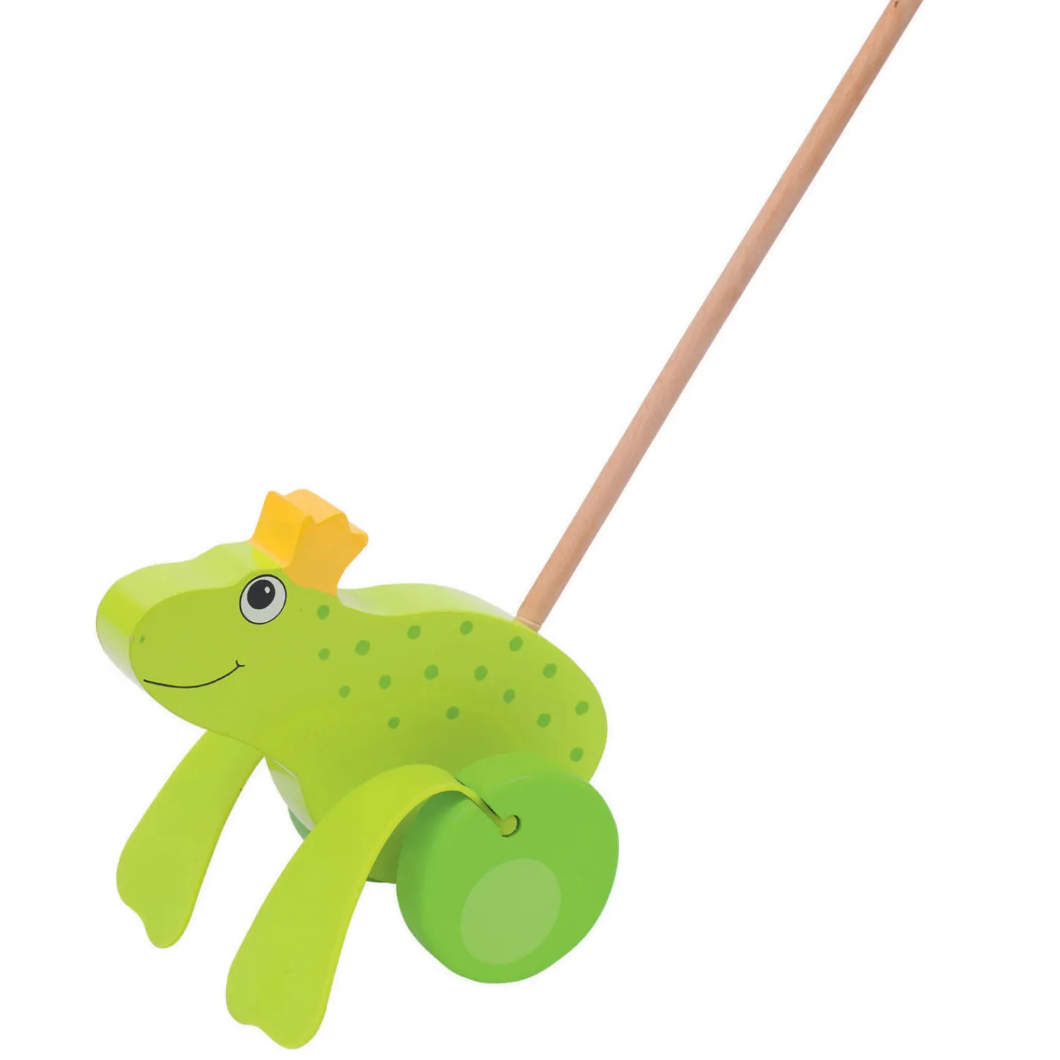 Houten duwfiguur in de vorm van Kikker de Koning. De poten van de kikker bewegen als je hem voor je uit duwt. De stok heeft een lengte van 60 cm.