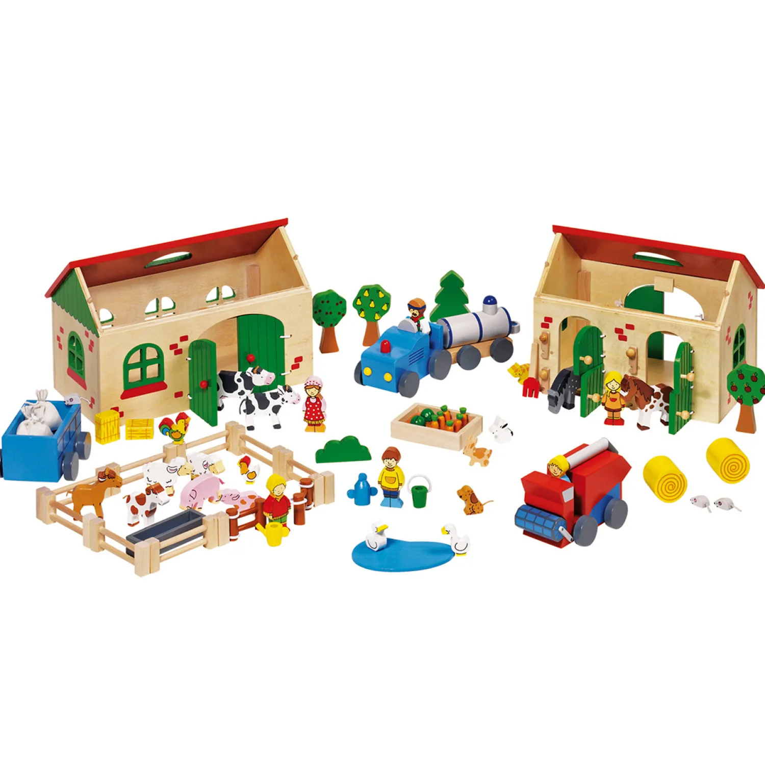Help jij de boer en boerin op de boerderij? Help met het voeren van de dieren, het maaien van het gras en het oogsten van de groentes en het fruit. Haal iedere ochtend de dieren van stal en zet ze in het weiland of in de omheining. Pas je wel op dat de muizen het voer van je dieren niet op eten? Deze 71-delige boerderij is van hout. Heeft onder andere twee schuren, een trekker, verschillende (fruit)bomen, verschillende (boerderij) dieren en nog veel meer accessoires.