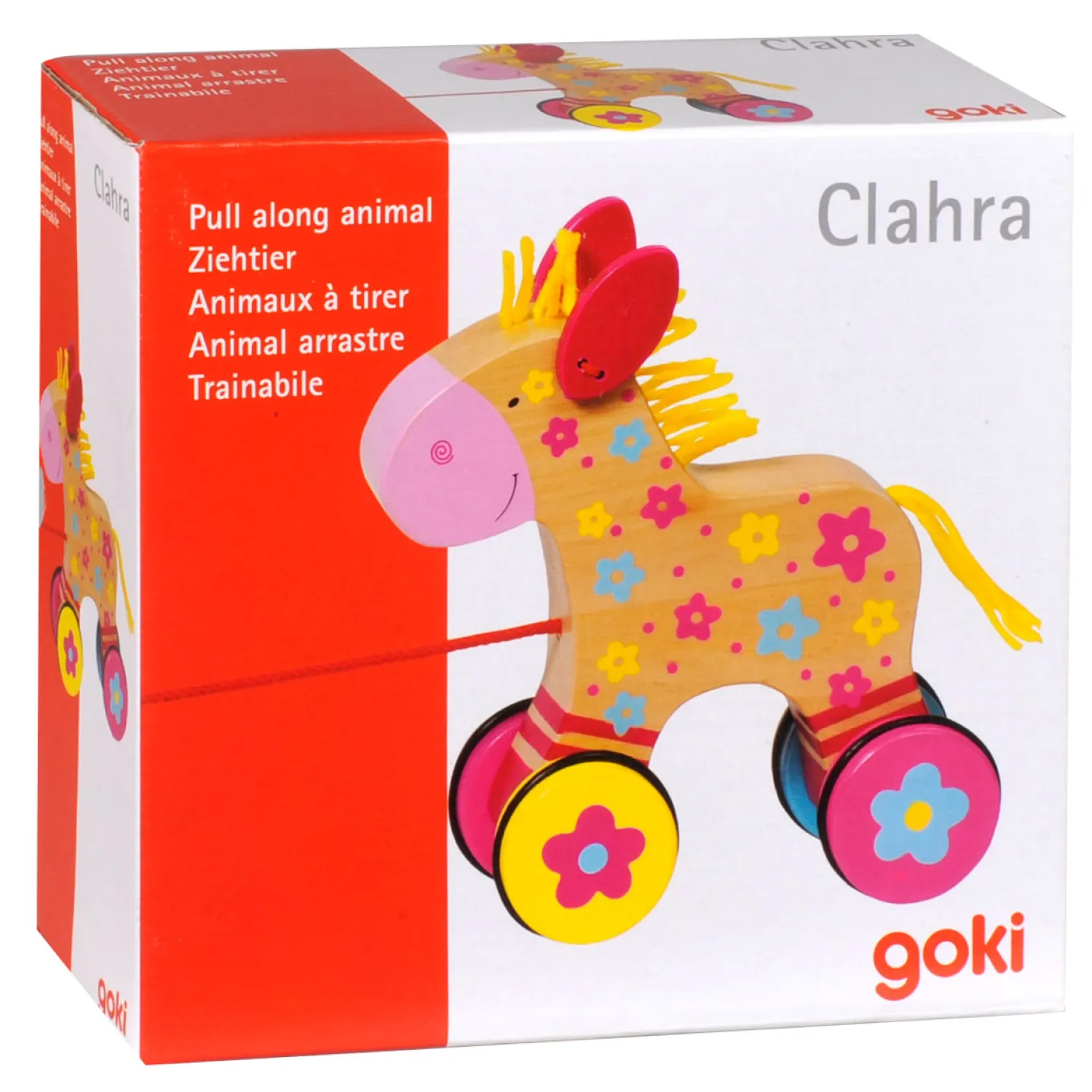 Vrolijk gekleurd trekpaard dat je overal volgt. Leer lopen met dit schattige paardje aan een koord. Houd het koortje vast en zet je eerste stappen door het huis, samen met Clara het paard.