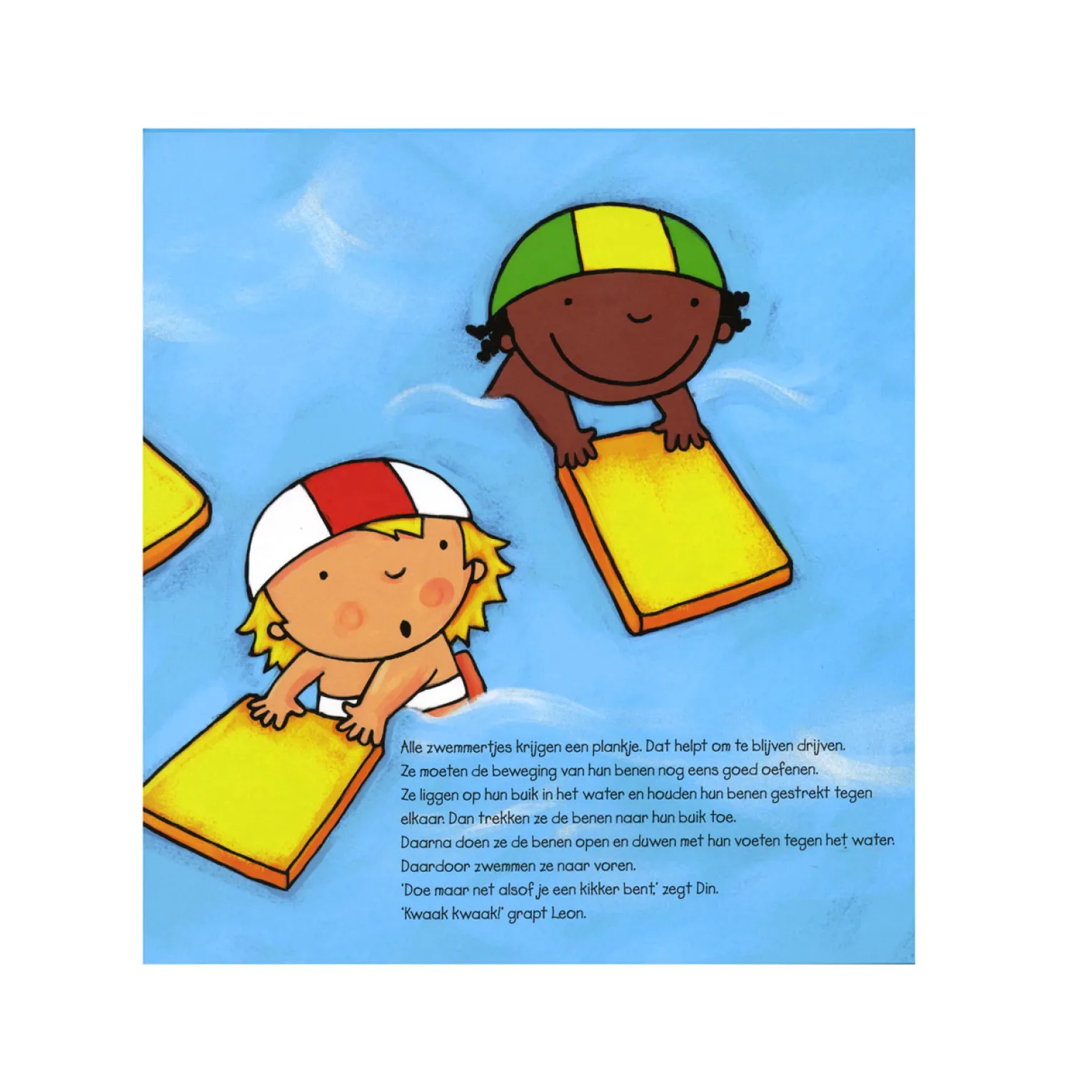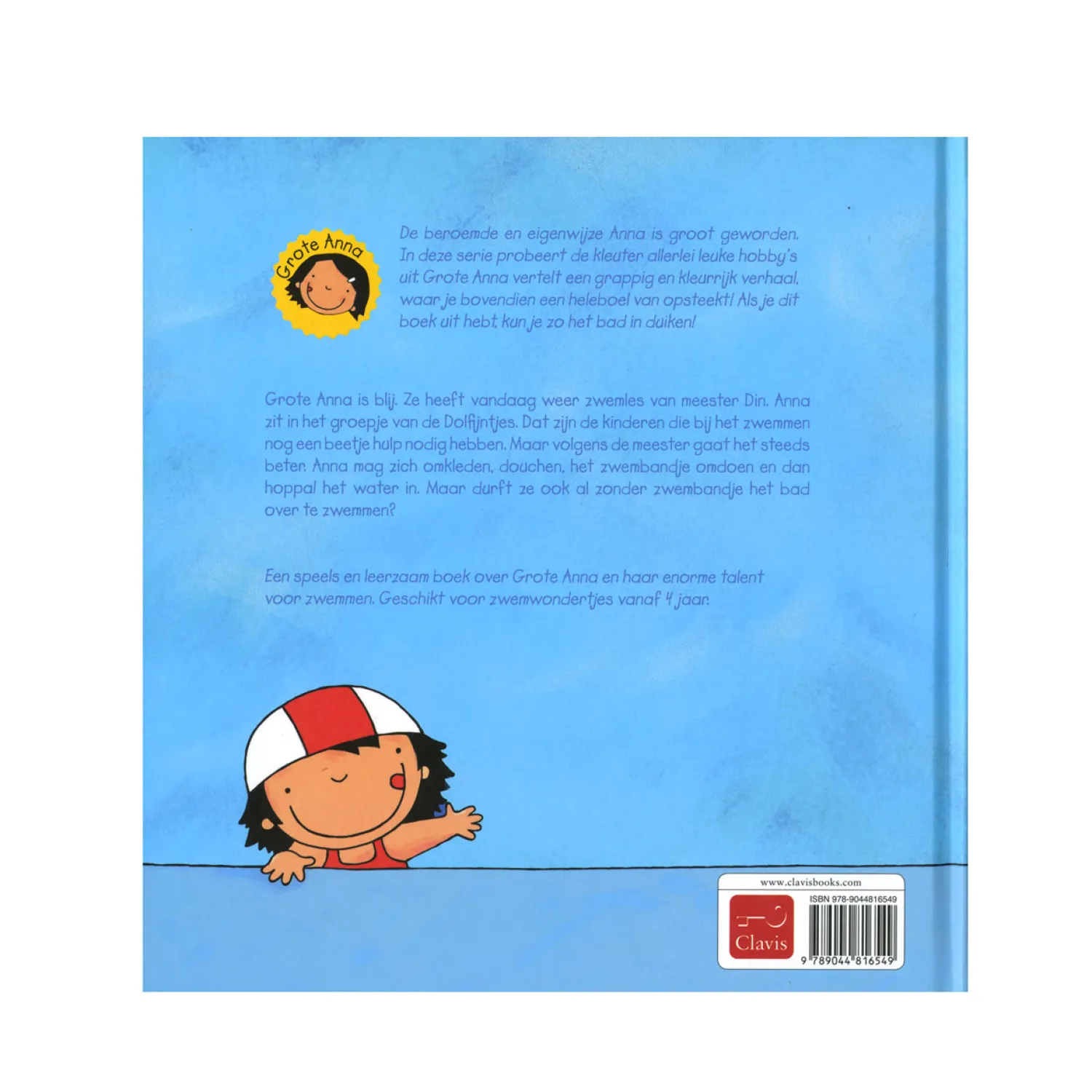 Grote Anna is blij. Ze heeft vandaag weer zwemles van meester Din. Anna zit in het groepje van de dolfijntjes. Dat zijn de kinderen die nog leren zwemmen. Maar volgens de meester gaat het steeds beter. Anna mag zich omkleden, douchen, het zwembandje omdoen en dan hop! het water in. Maar durft ze ook al zonder zwembandje het bad over te zwemmen? Een speels en leerzaam boek over Grote Anna en haar talent voor zwemmen. Geschikt voor waterliefhebbers vanaf 4 jaar. Herkenbaar voor kleuters die zelf op zwemles gaan.