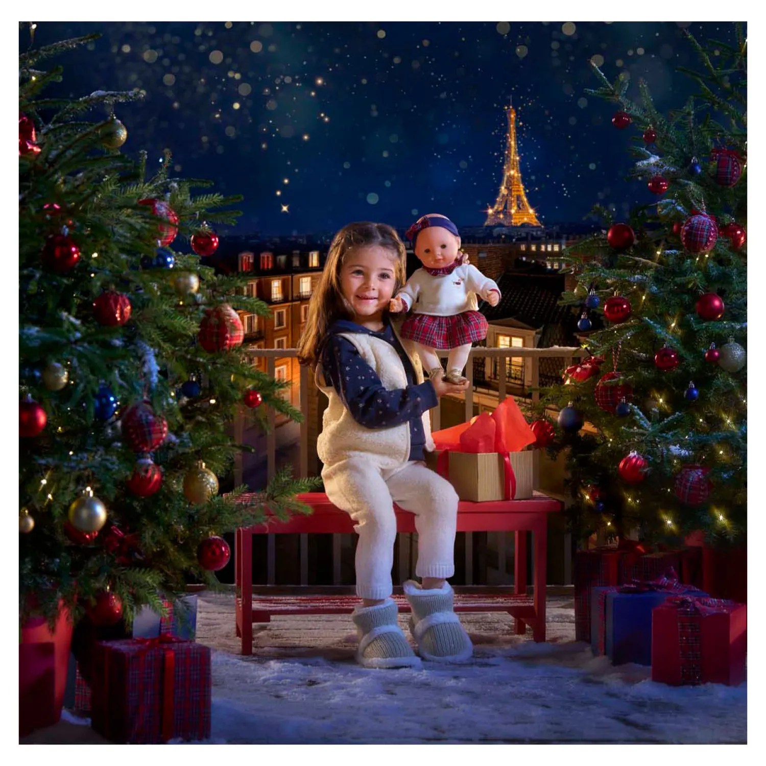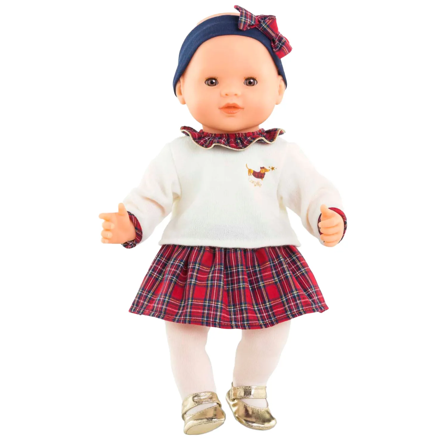 Voor de feestdagen is Suzanne prachtig aangekleed met een ivoorkleurige gebreide trui met geruite kraag, een bijpassende rok, een panty en gouden schoentjes. Op haar trui staat een schattige teckel in een geruite jas. De outfit wordt compleet gemaakt met een marineblauwe haarband met strik.