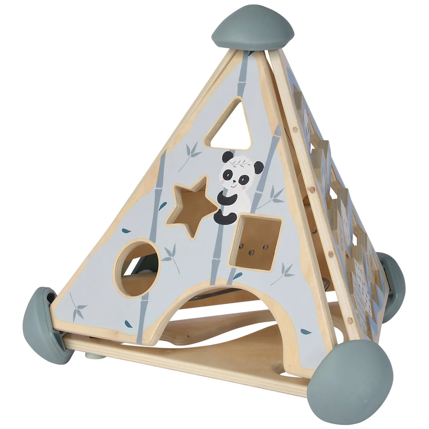 De verschillende zijden maken het activiteitencentrum bijzonder handig om samen te spelen met broertjes, zusjes, vriendjes of vriendinnetjes! De driehoek is bewerkt met mooie illustraties van panda’s, bladeren en bamboestokken in rustige blauwtinten.