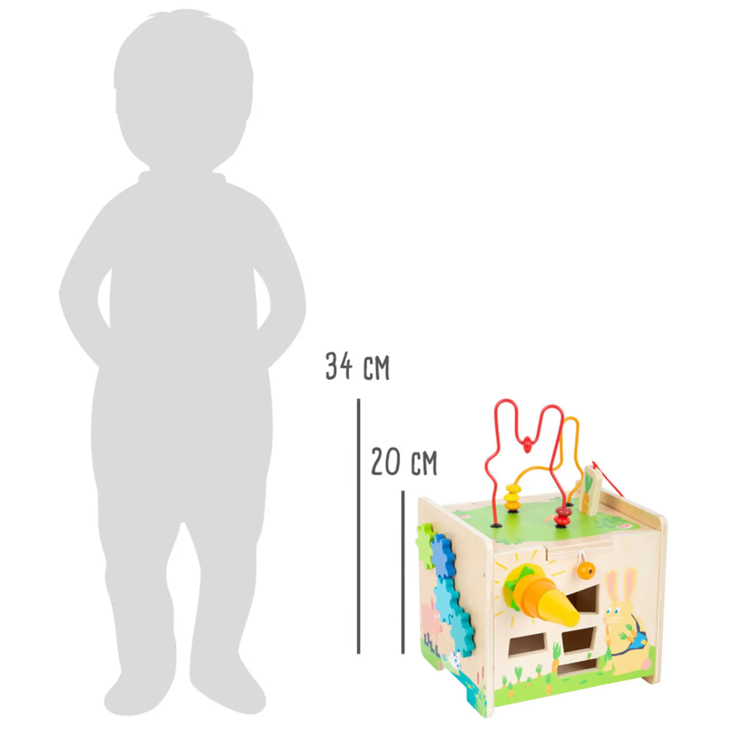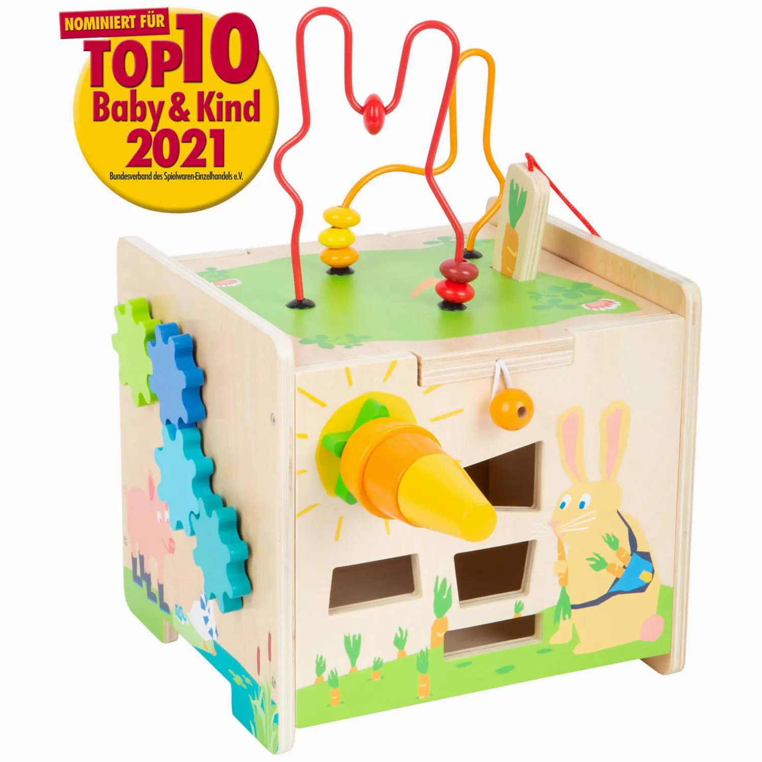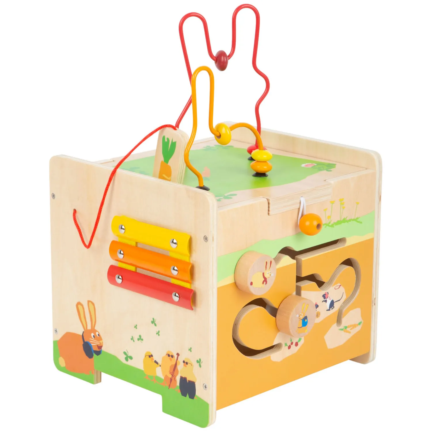 Met een kralendoolhof in de vorm van een konijn, vijf speelruimtes, een vorm-passend spel, een glijdend labyrint, een versnellingsspel en een xylofoon, is deze motorische kubus een echt multitalent als het gaat om spelen en ontdekken. Een hoogtepunt: de wortel, een vorm- en constructiespel in één, kan aan de zijkant worden geschroefd. Wanneer het deksel dat met een grendel is vastgezet, wordt verwijderd en ondersteboven in de kubus wordt opgeborgen, verandert dit speelgoed in een stevige kinderkruk! Jonge motoriekprofessionals worden bij het spelen met deze kubus begeleid door schattige babydieren en beleven samen met hen spannende avonturen in het thema van de boerderij. Dat bevordert hun nieuwsgierigheid en hun natuurlijke ontdekkingsdrang. Het is een uniek motorisch speelgoed met goed zichtbaar houtmateriaal dat de nieuwe favoriet in de kinderkamer zal worden!