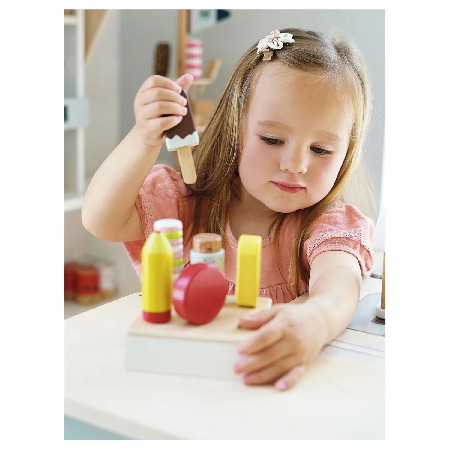 Ieder kind is dol op ijslollies! De populairste diepvriestraktatie voor onderweg hoort in elke kinderkamer voor realistisch rollenspel in het thema van een ijscafé. Geschikt vanaf 24 maanden.
