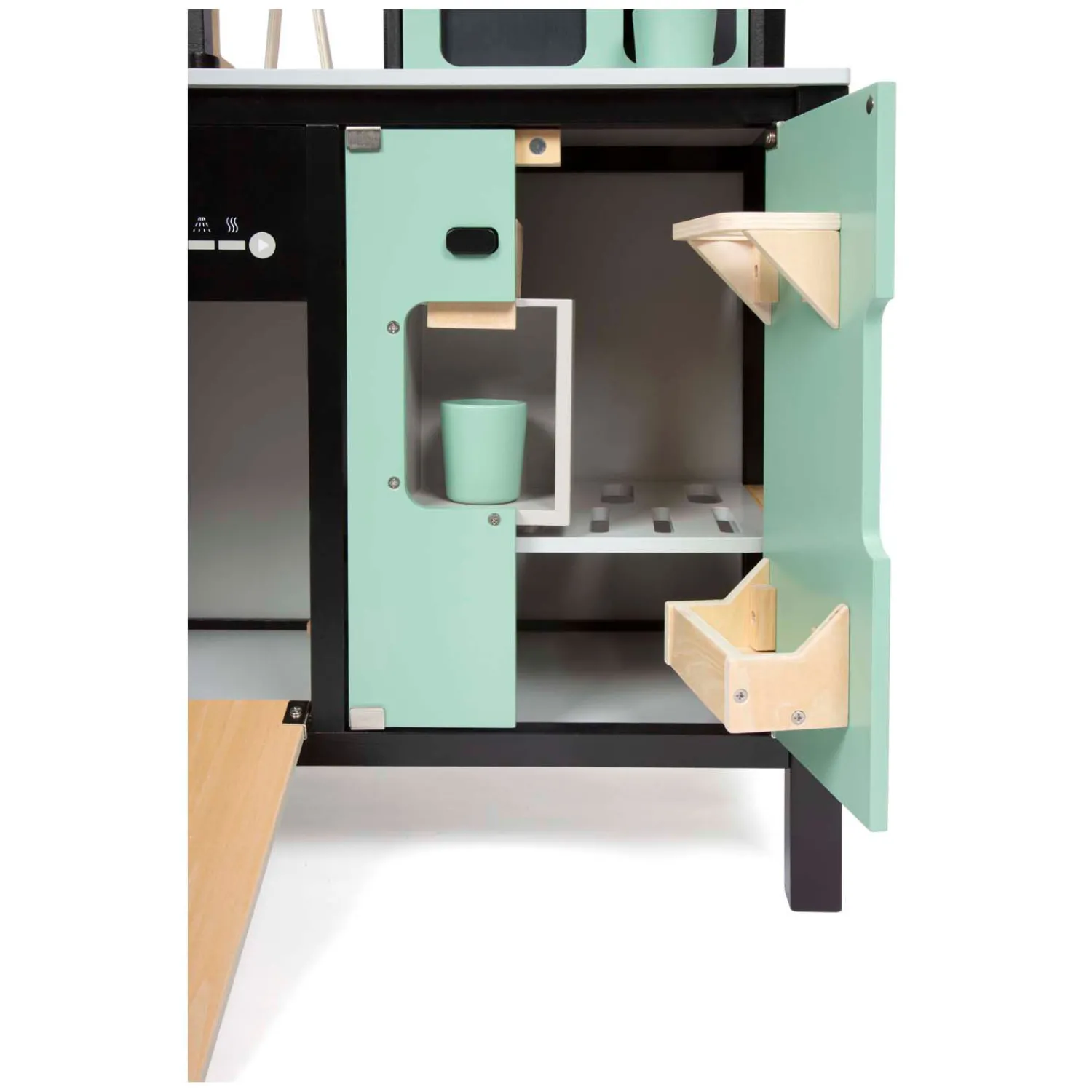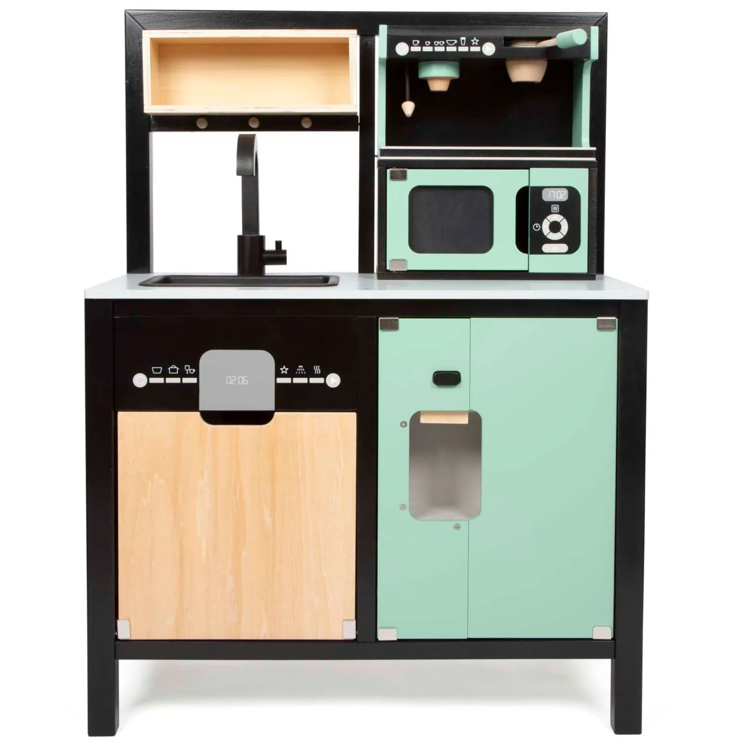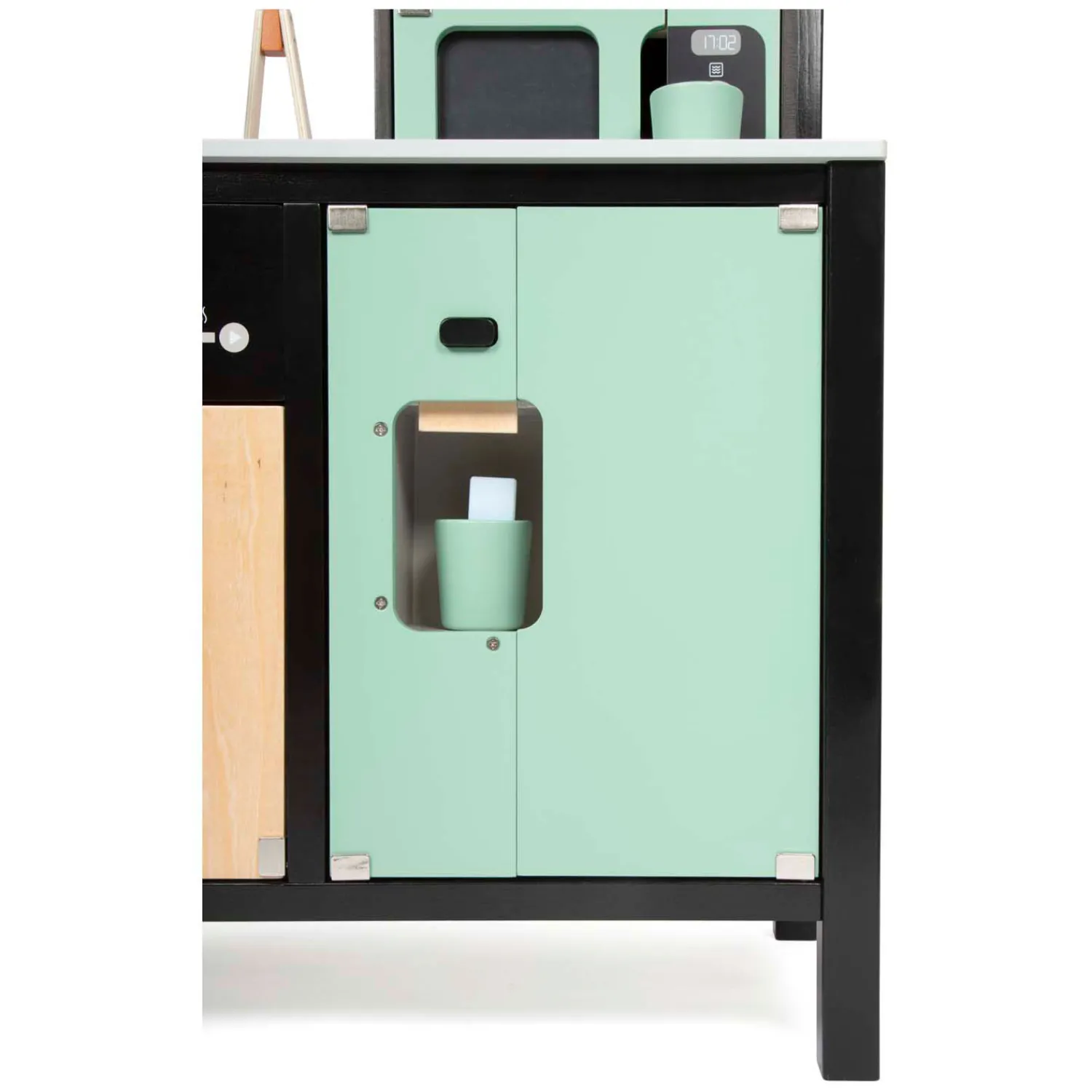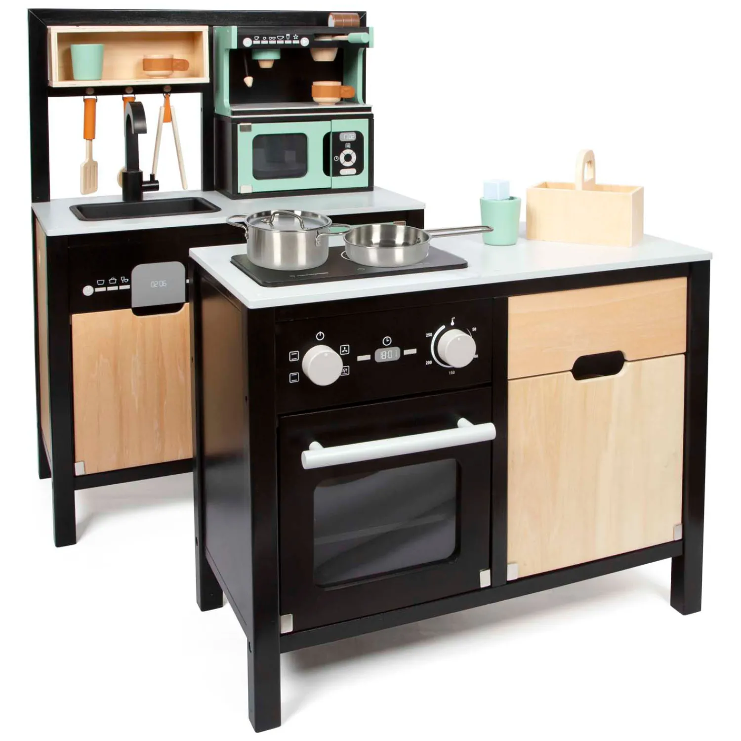De keuken bevat een pan, pot met deksel, drie kookspullen, twee koffiekopjes, drie koffieschijven, twee mokken en drie munten van hout. De moderne industriële look benadrukt met een zwart frame maakt van deze houten speelkeuken een absolute blikvanger!