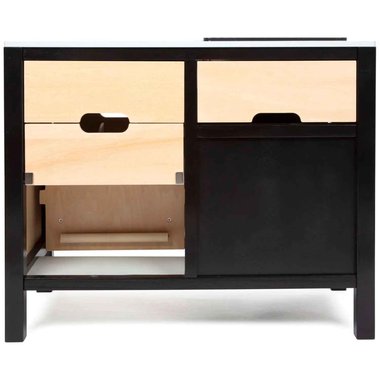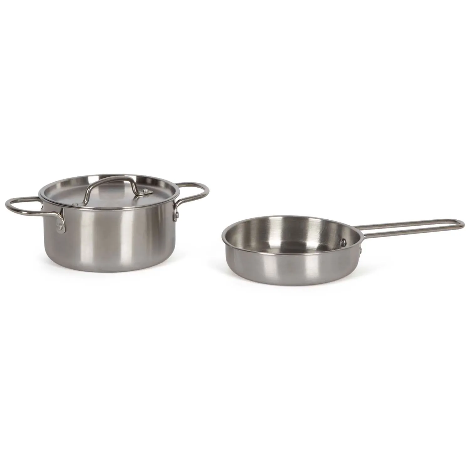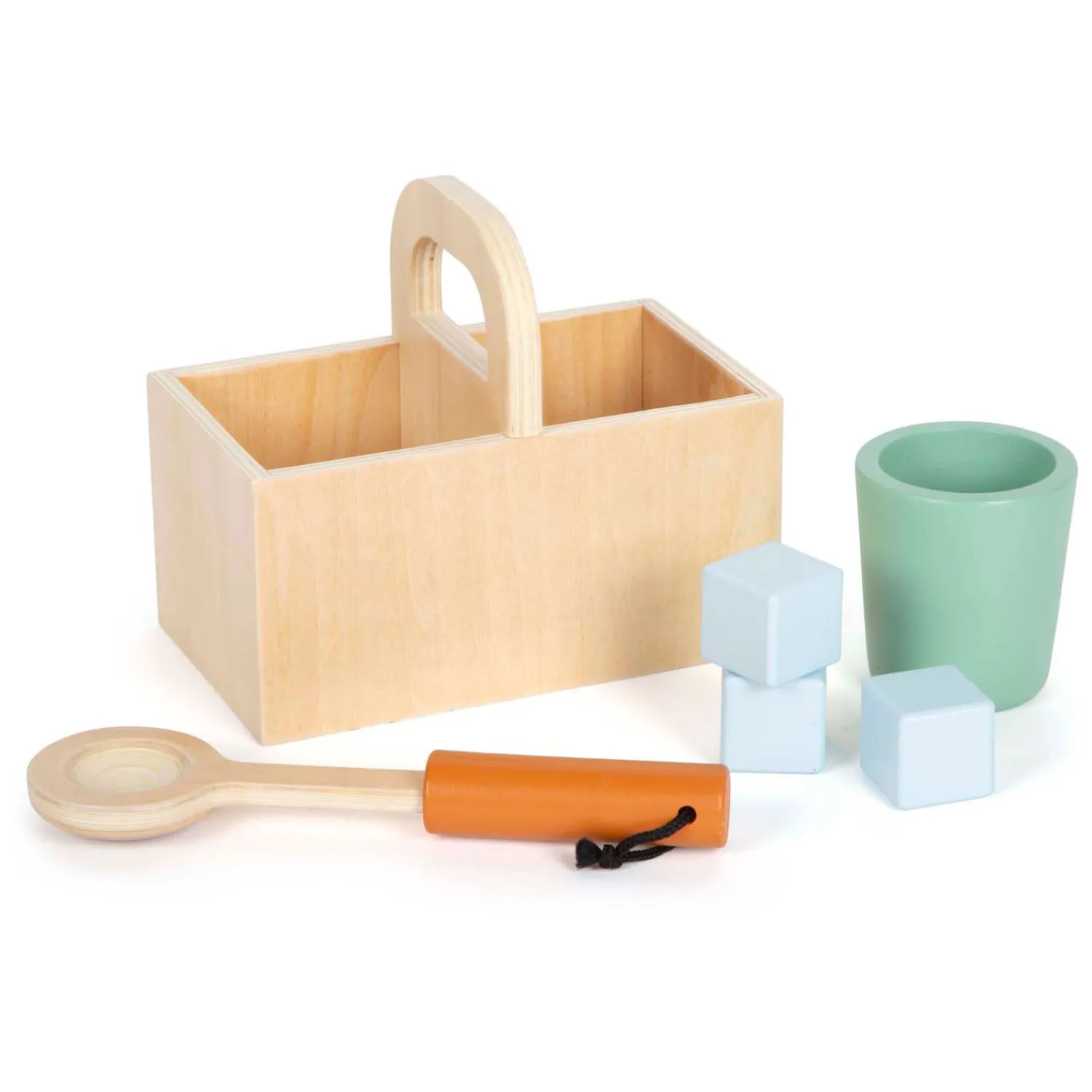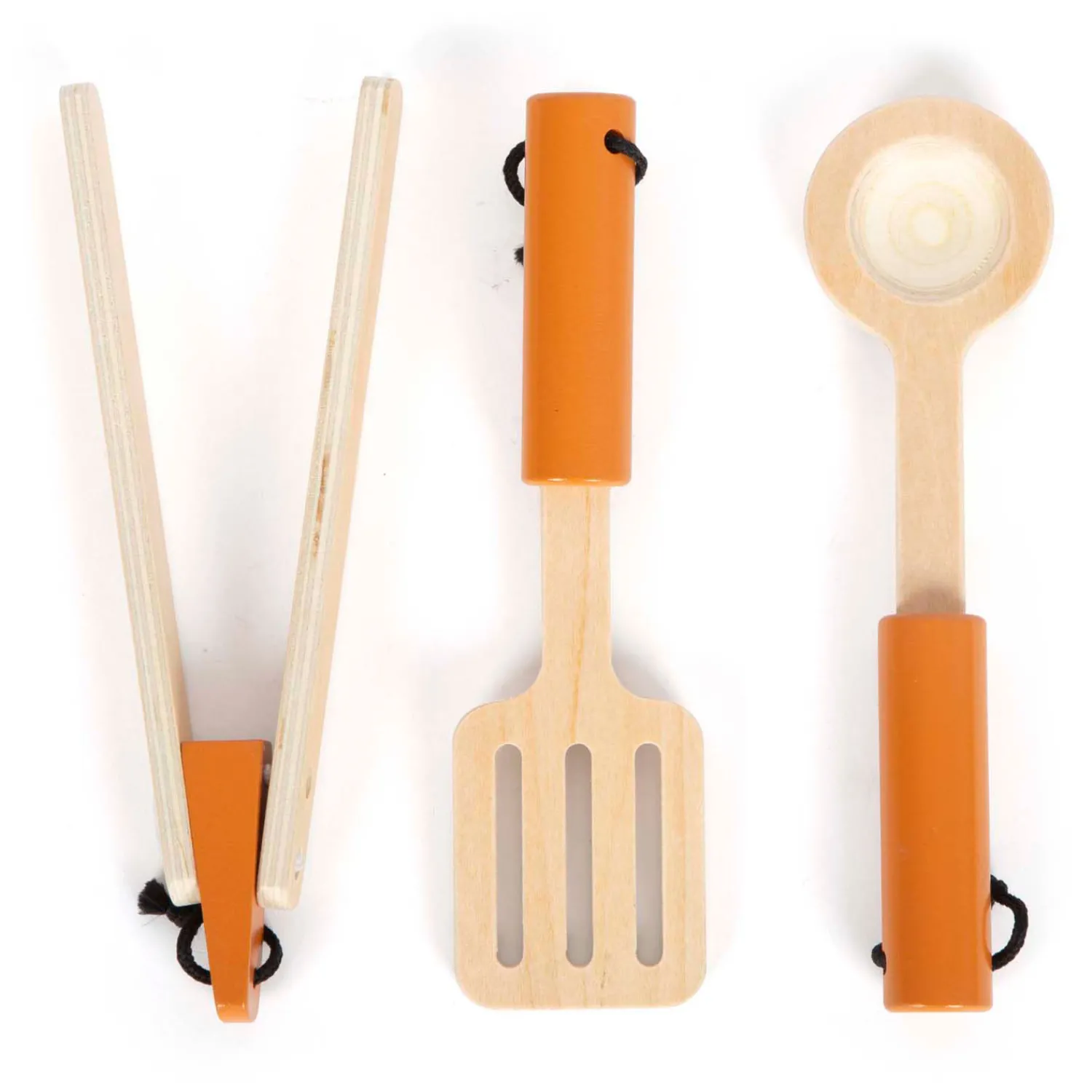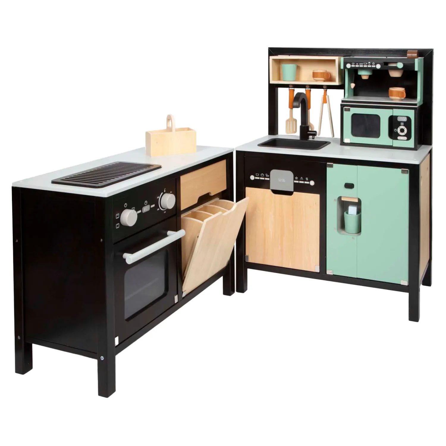De keuken bevat een pan, pot met deksel, drie kookspullen, twee koffiekopjes, drie koffieschijven, twee mokken en drie munten van hout. De moderne industriële look benadrukt met een zwart frame maakt van deze houten speelkeuken een absolute blikvanger!