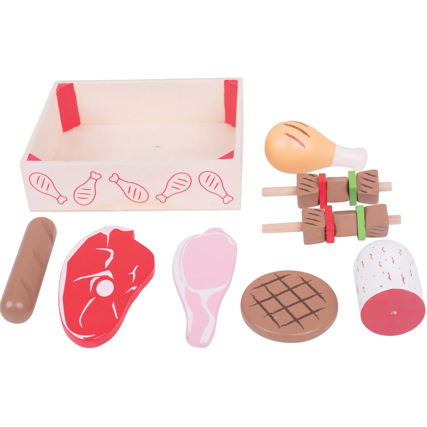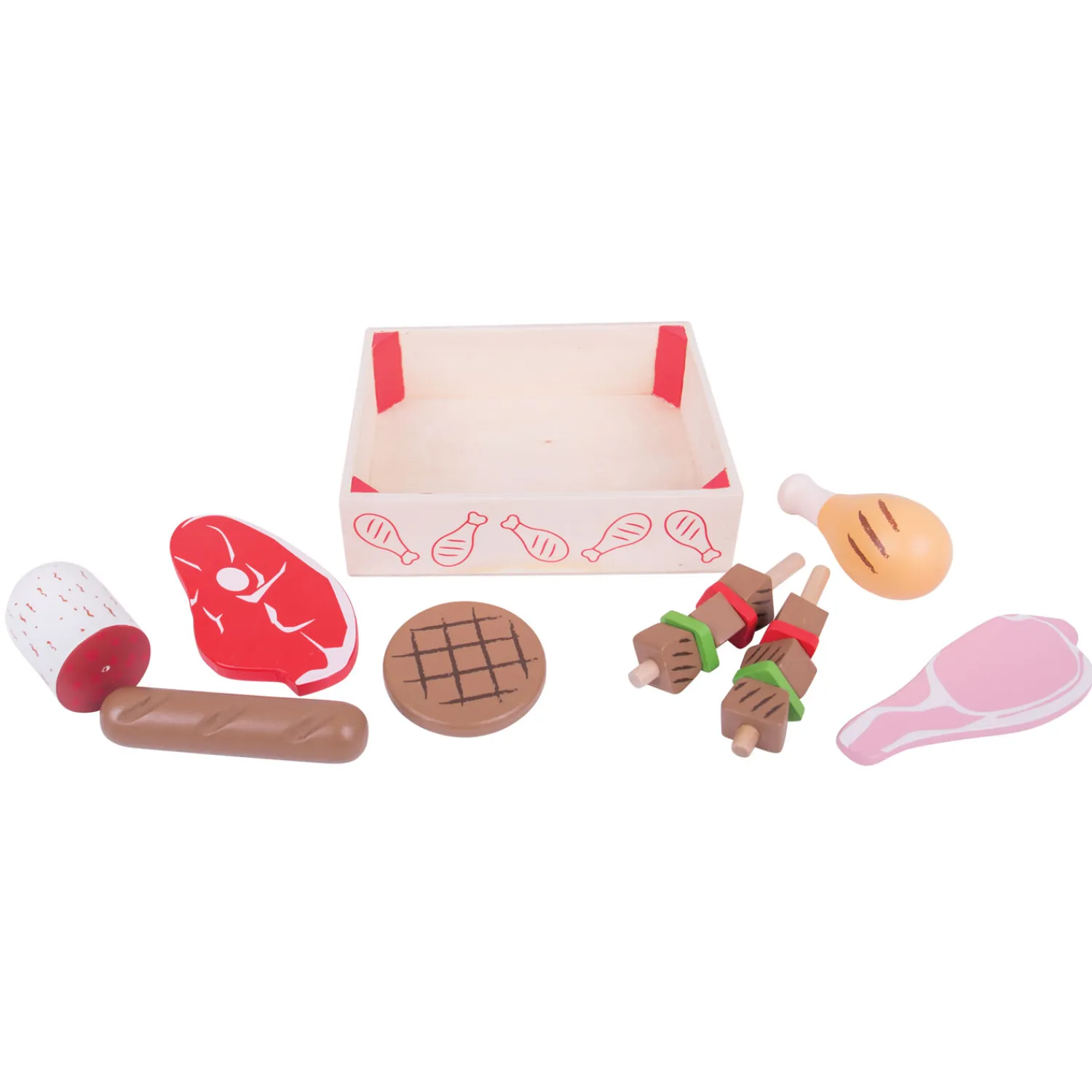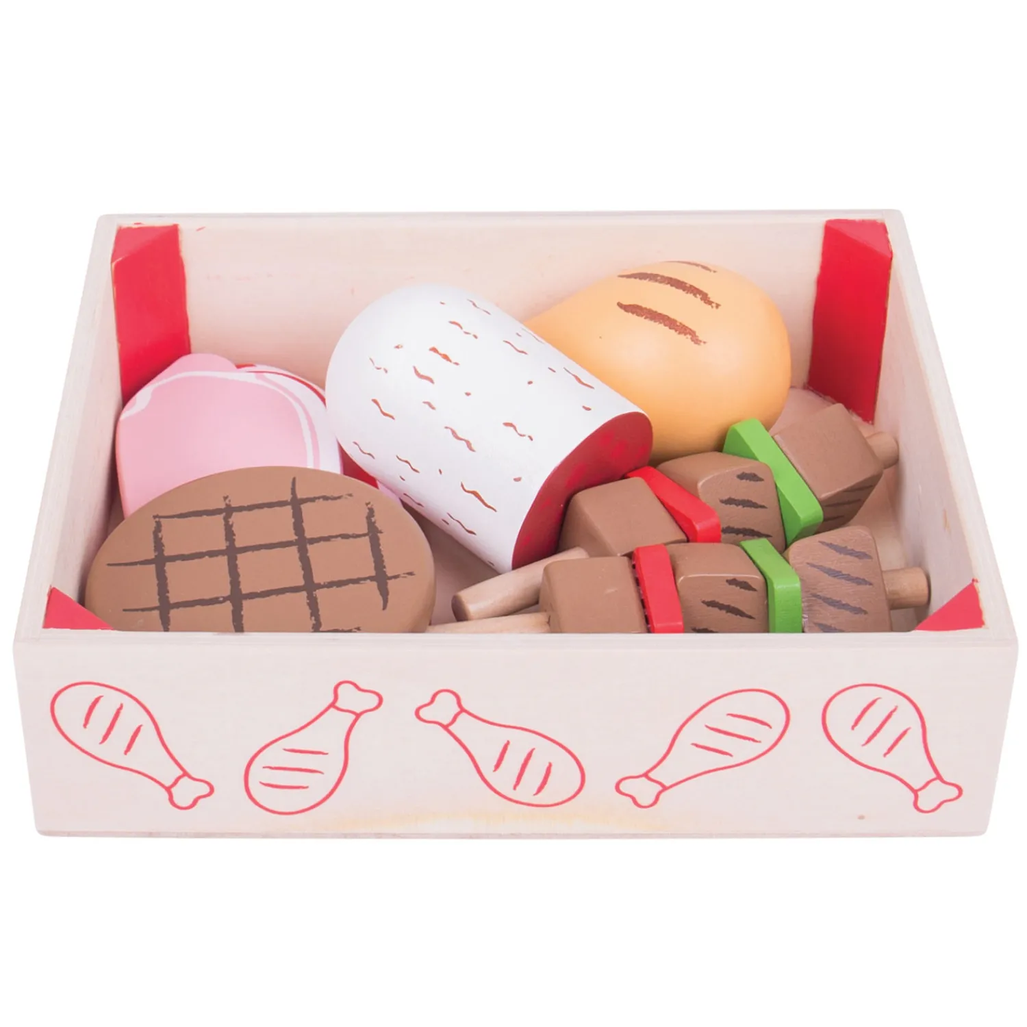 Organiseer een barbecue met dit houten kistje met vleeswaren van BigJigs. Het houten kistje bevat prachtig afgewerkte houten figuren van shaslicks, worstjes, hamburgers, een drumstick, worst en karbonades. Wat zullen je gasten smullen! Spelen met het speeleten van de vleeswaren stimuleert de ontwikkeling van fantasie en sociale vaardigheden.