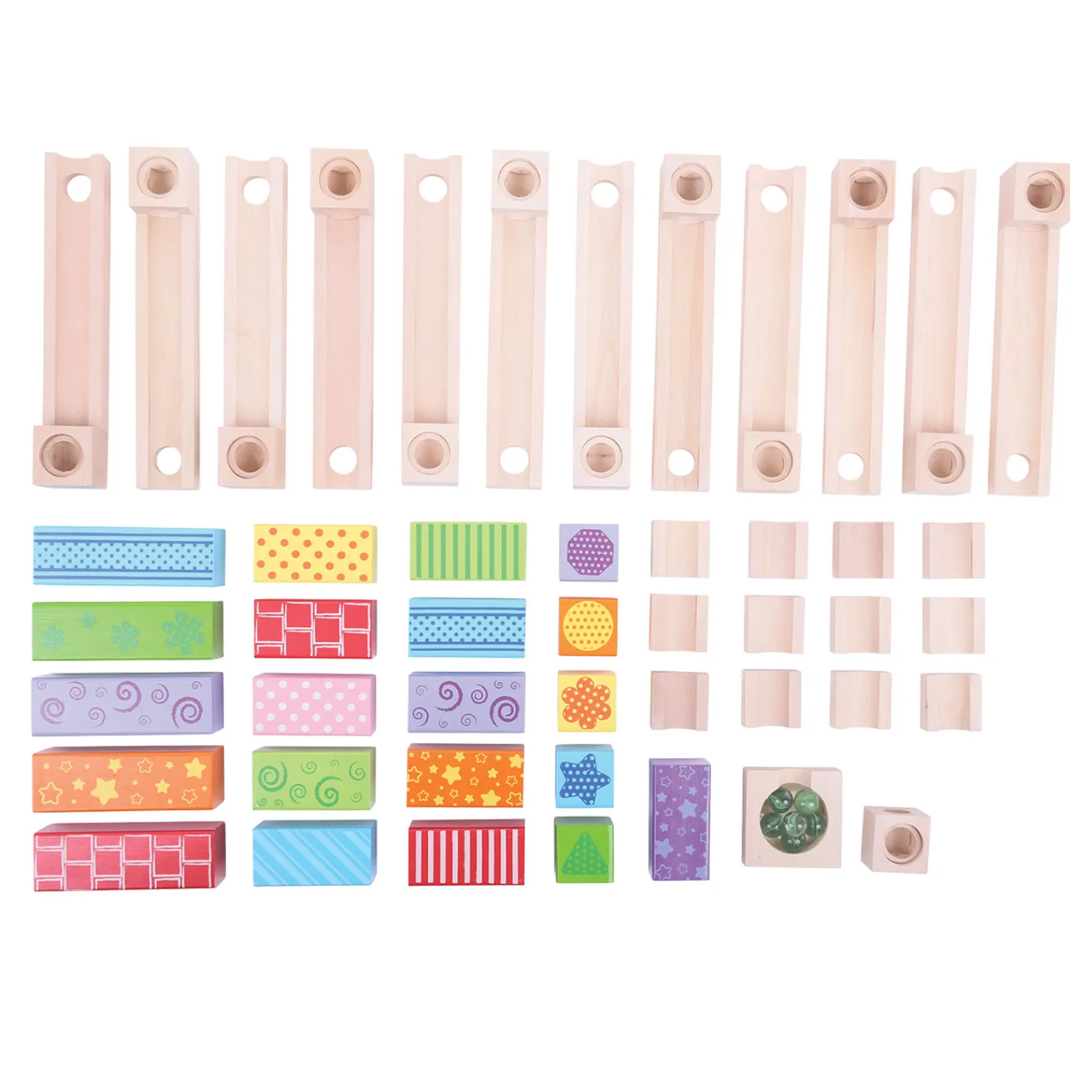 Inhoud: 6 knikkers, 21 gekleurde bouwblokjes in verschillende maten met verschillende kleurrijke prints en 26 knikkerbaan blokken in verschillende formaten.