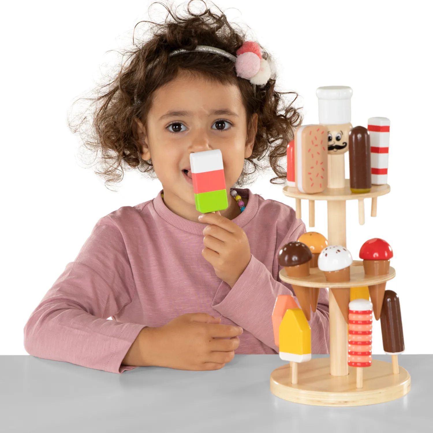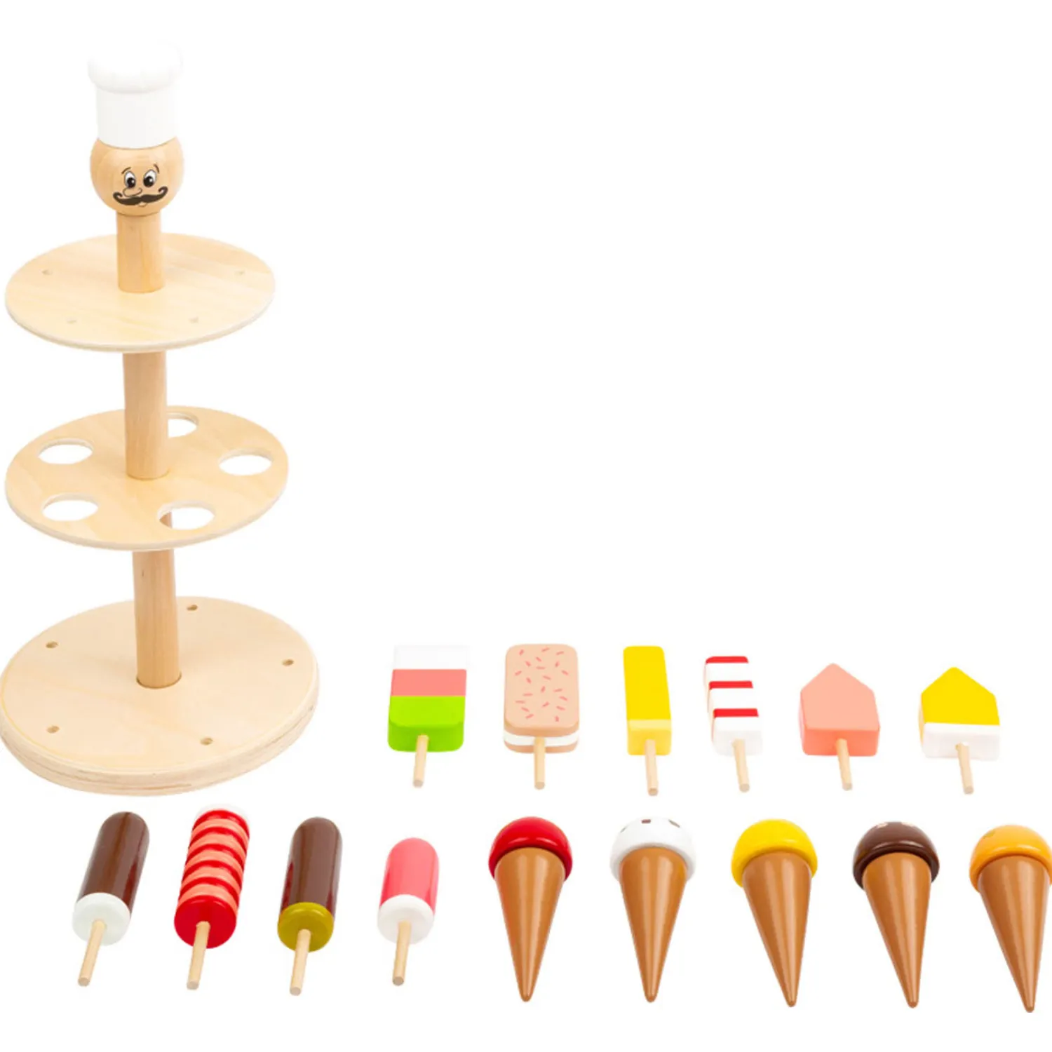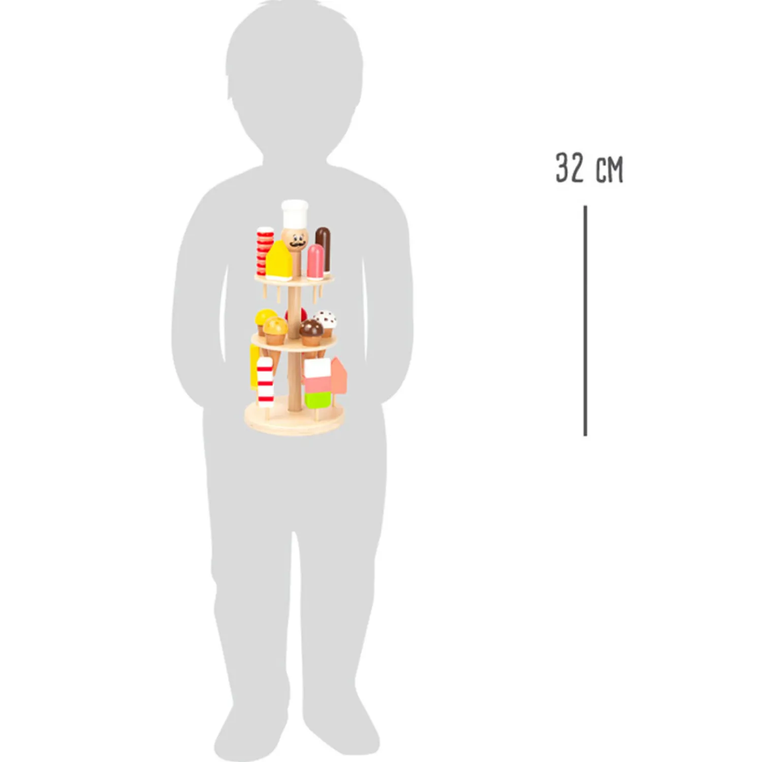 Een ijsje kan er altijd wel in! Met een complete ijskraam voorzie je iedereen van de lekkerste en mooiste ijsjes. Deze kraam is helemaal gemaakt van kwalitatief hout. De set bestaat uit een houten ijsjeshouder, 10 ijsjes op een stokje en 5 schepijsjes. De houten houder is 32 cm hoog.