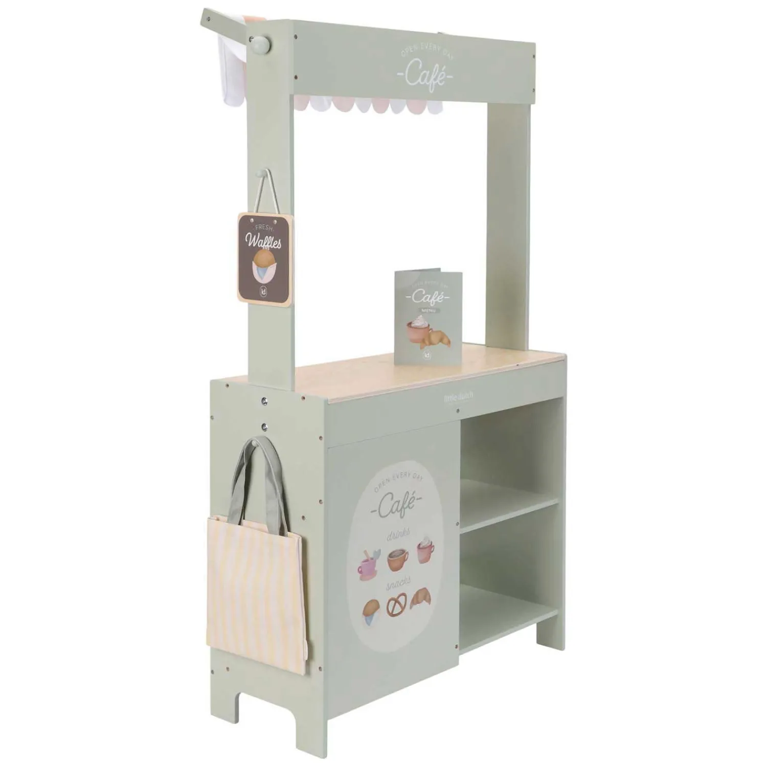 boodschappentas en kratten voor een echte winkelervaring. Draai de marktkraam om en het wordt een café, compleet met menukaart en vrolijke illustraties. Combineer het met de kassa, weegschaal of taartstandaard voor nog meer speelplezier. Wat staat er vandaag op het menu?
