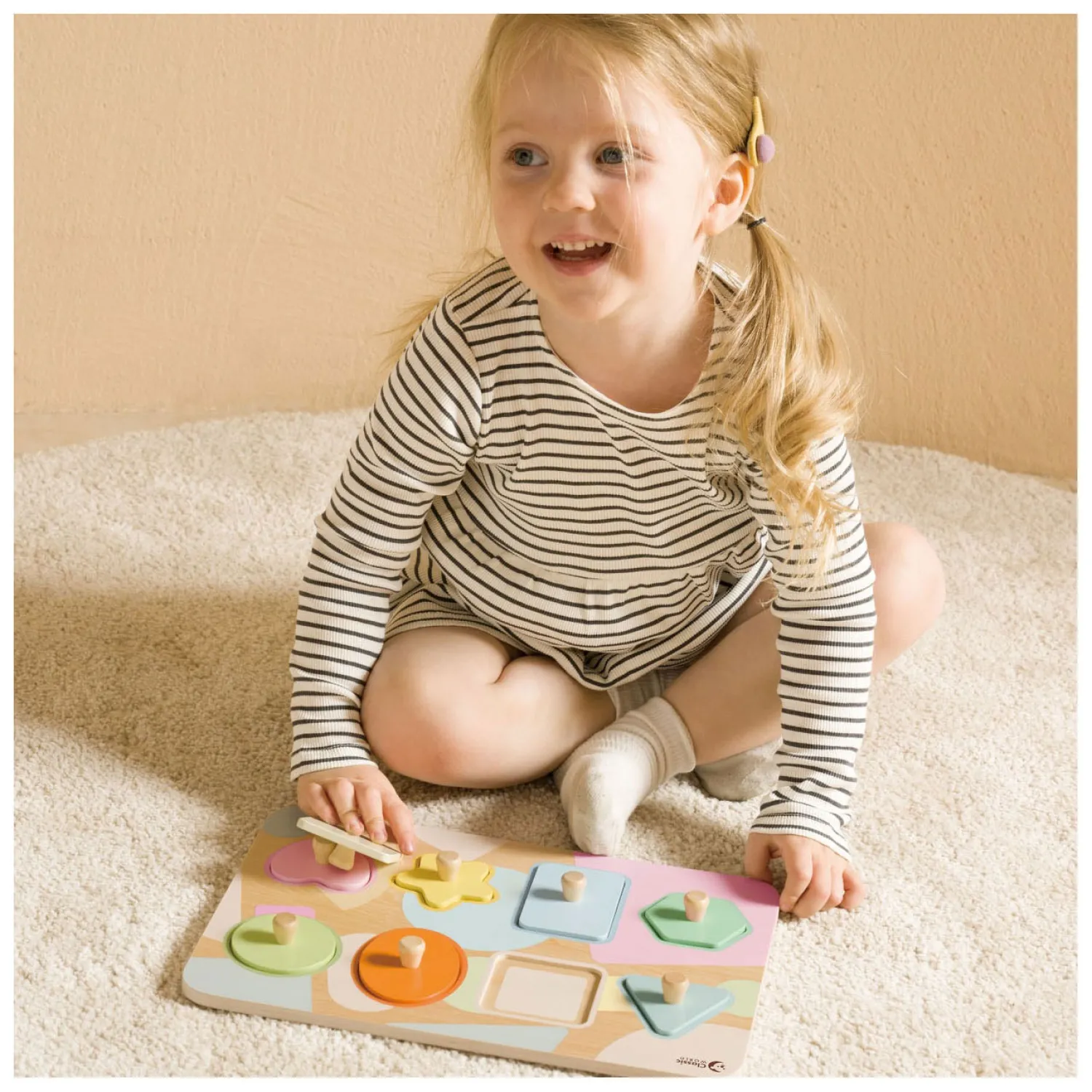 Deze houten vormen-penpuzzel van stapelspeelgoed met extra dik puzzelbord in verschillende geometrische vormen en pastelkleuren. Laat uw kind platte geometrische figuren herkennen door te kijken en te voelen. Wanneer kinderen proberen om vormpuzzels te matchen met het doel of combinaties te maken, helpt het om vroege vorm- en kleuronderscheidingsvaardigheden op te bouwen.