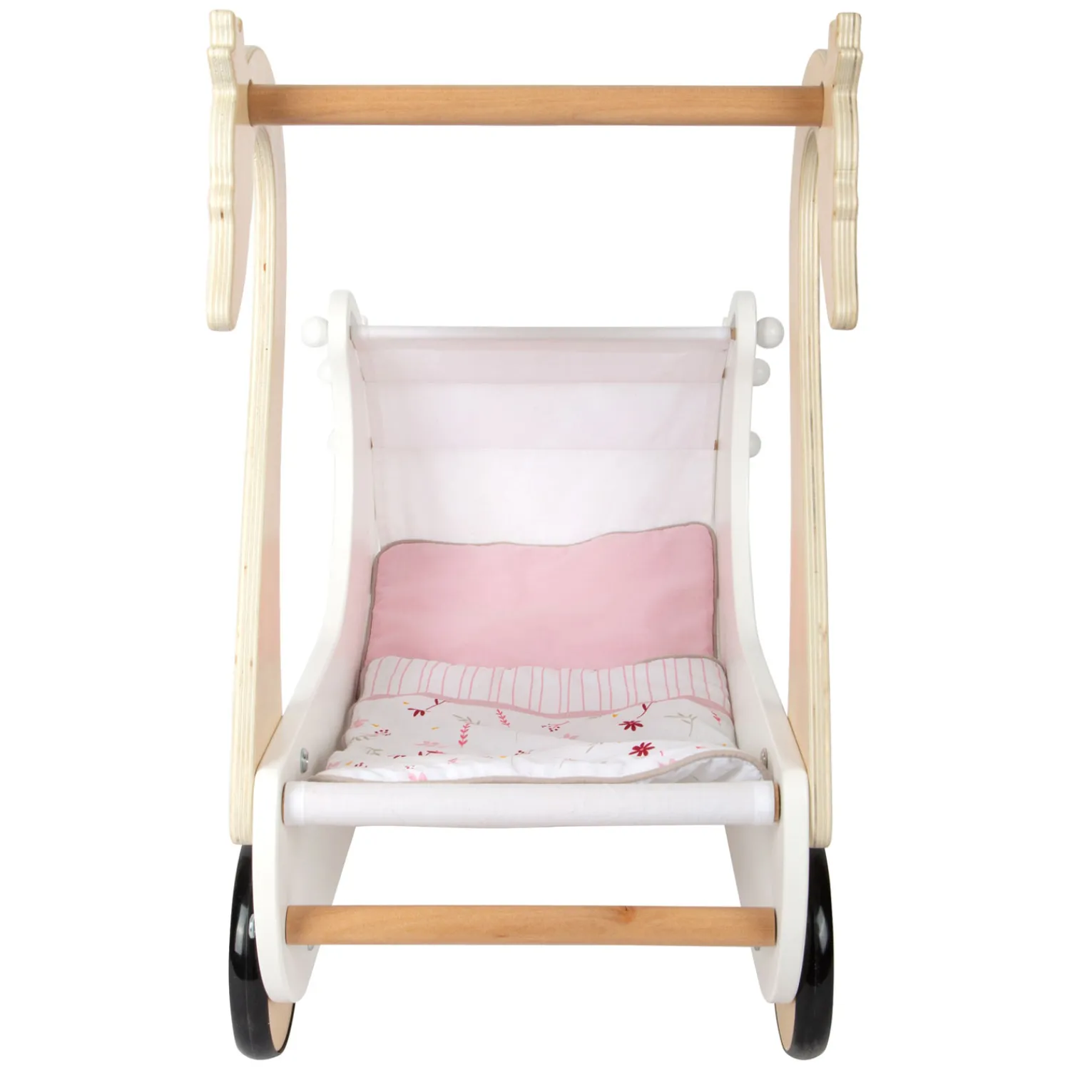 Ideaal voor veelzijdig spelen met poppen en samen wandelen! Deze hoogwaardige, stabiele poppenwagen past met zijn eenvoudige design stijlvol en decoratief in de kinderkamer en maakt indruk met het zichtbare houtmateriaal, de handgreep van massief hout en het wasbare katoenen textiel. Bovendien zorgen de afgeronde randen voor een bijzonder aangename haptische ervaring.