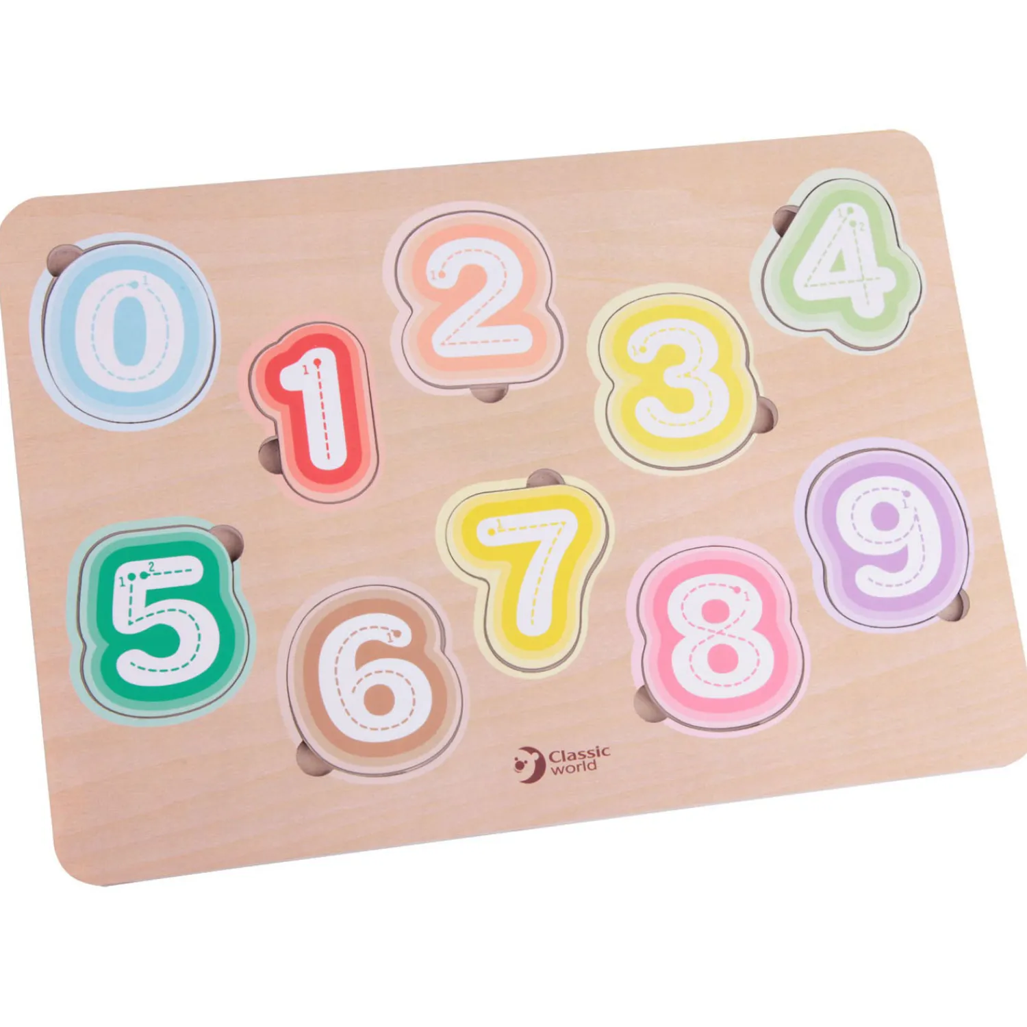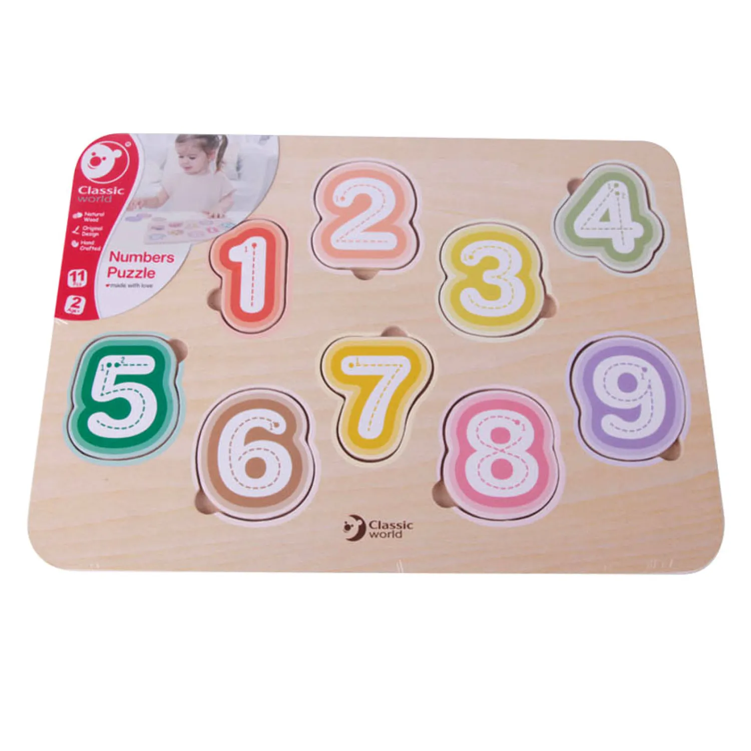 Leer de cijfers herkennen met deze Classic World Houten Puzzel. Op de puzzelstukken staat met lijnen aangegeven hoe de cijfers geschreven moeten worden. Met deze puzzel leer je ook tellen, op de puzzelplaat staat achter elk cijfer namelijk het aantal afgebeeld in fruit. Spelen met de puzzel stimuleert de ontwikkeling van hand-oog coördinatie en het logisch denken. Geschikt voor kinderen vanaf 2 jaar.