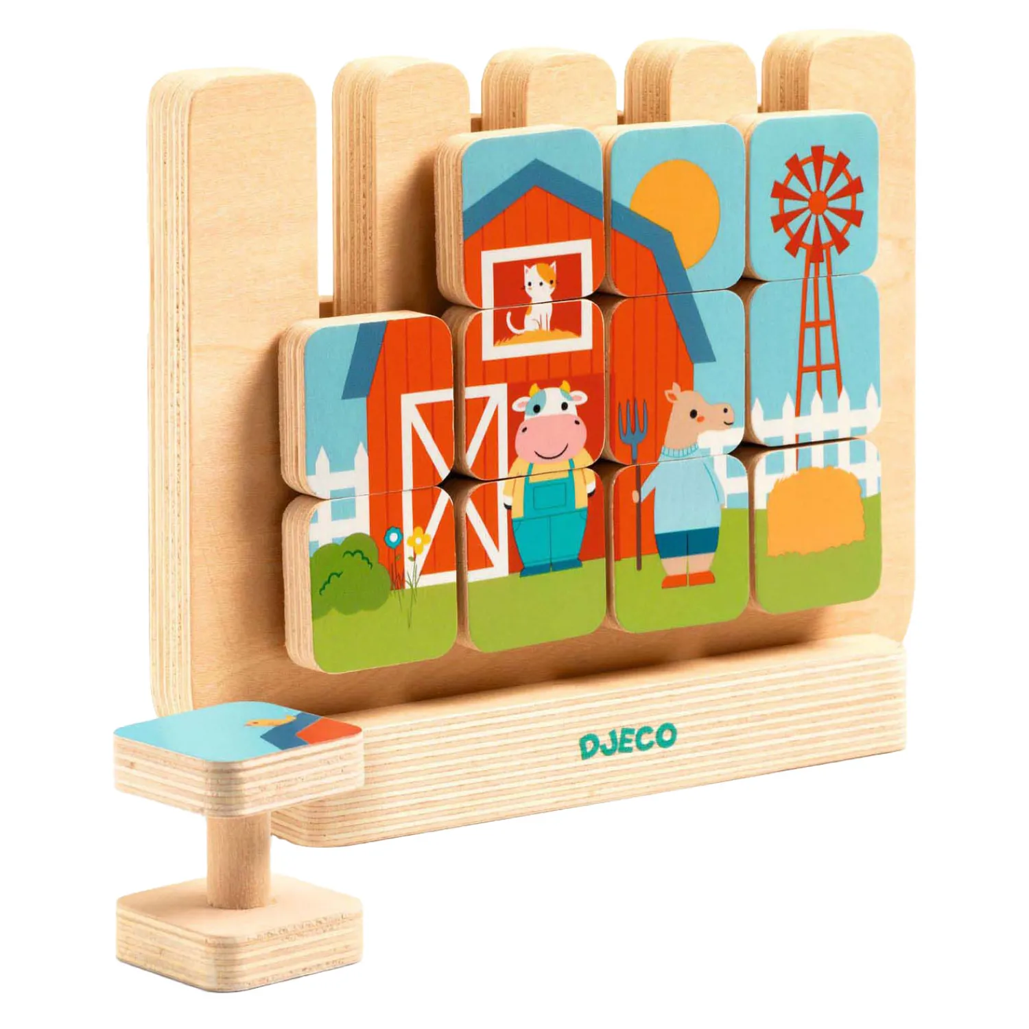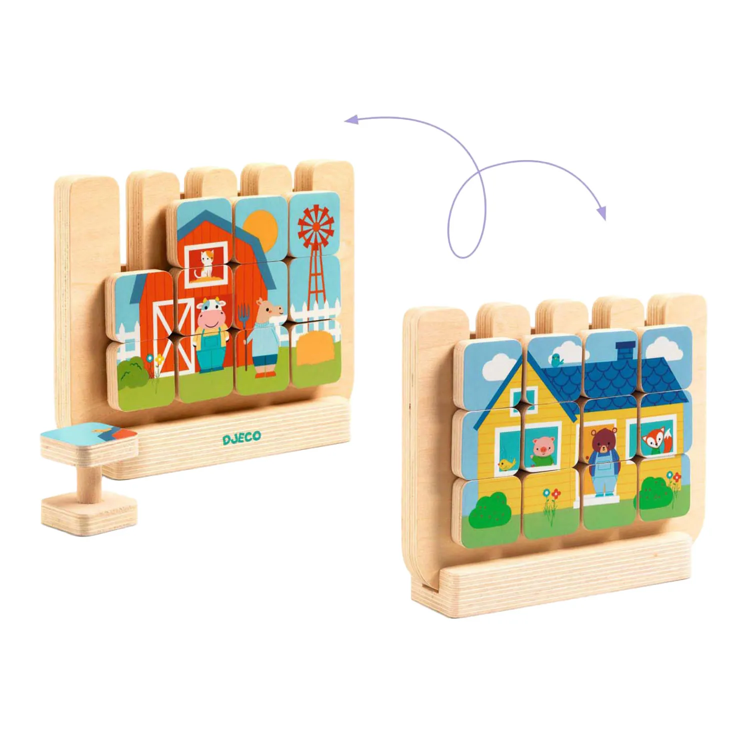 Het kind kiest een van de twee modellen, selecteert de juiste houten stukken en legt ze op de plaat om de afbeelding op de kaart perfect na te maken.