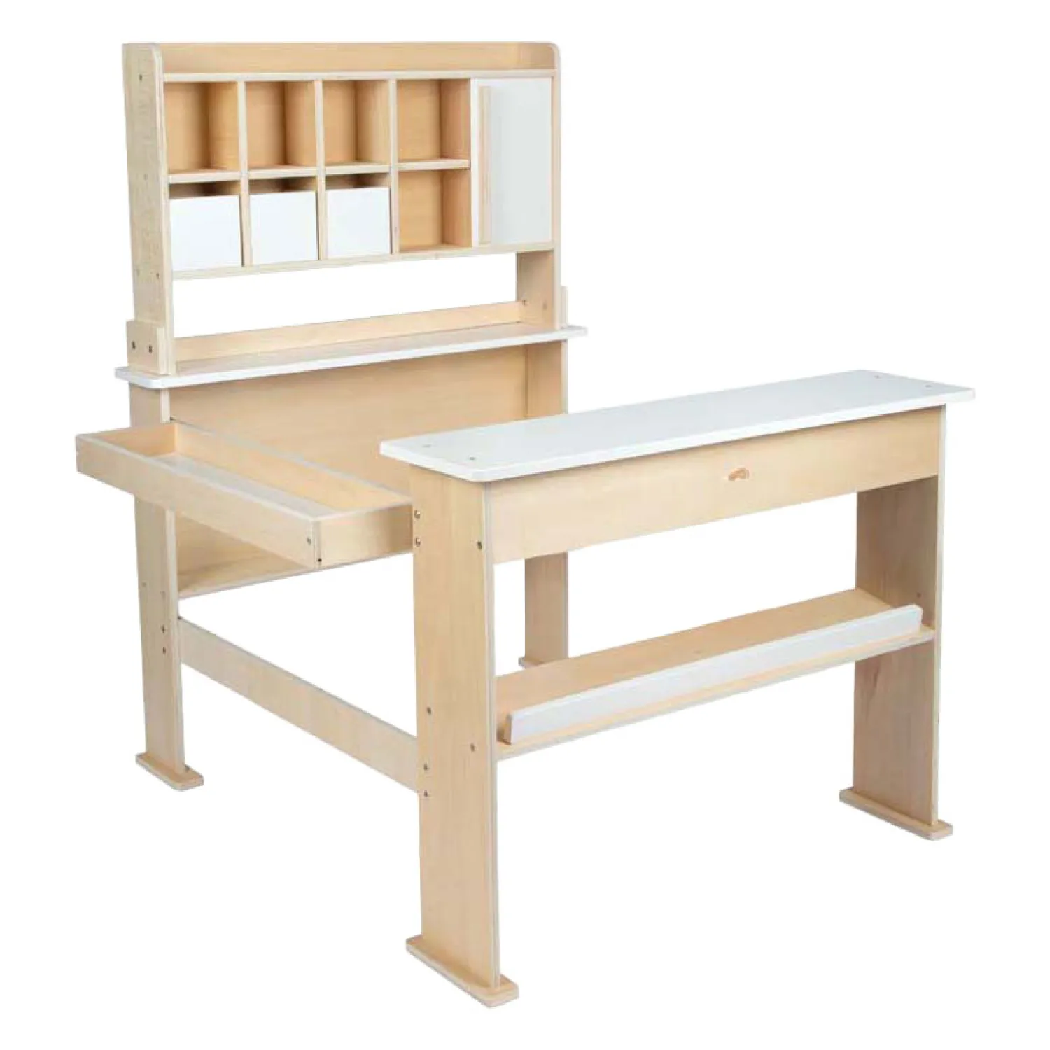 De houten speelwinkel maakt indruk op iedereen met zijn tijdloze uitstraling en functionele kenmerken. De schuifdeur in het verkooprek zorgt voor een realistische winkelervaring en biedt kinderen de mogelijkheid om erachter goederen te verstoppen en aan te vullen – net als in een echte winkel. Dozen met fruit en groenten, verpakte goederen en nog veel meer kunnen aan het winkelend publiek worden gepresenteerd en bieden een breed scala aan speelmogelijkheden, van marktkraam tot winkel. Het is een verkoopkraam voor speels leren op zijn best: kopen en verkopen, omgaan met getallen en sociale interactie leren staan op het programma! Deze speelwinkel is stevig en veilig geconstrueerd, biedt langdurig speelplezier en stimuleert creatief rollenspel!