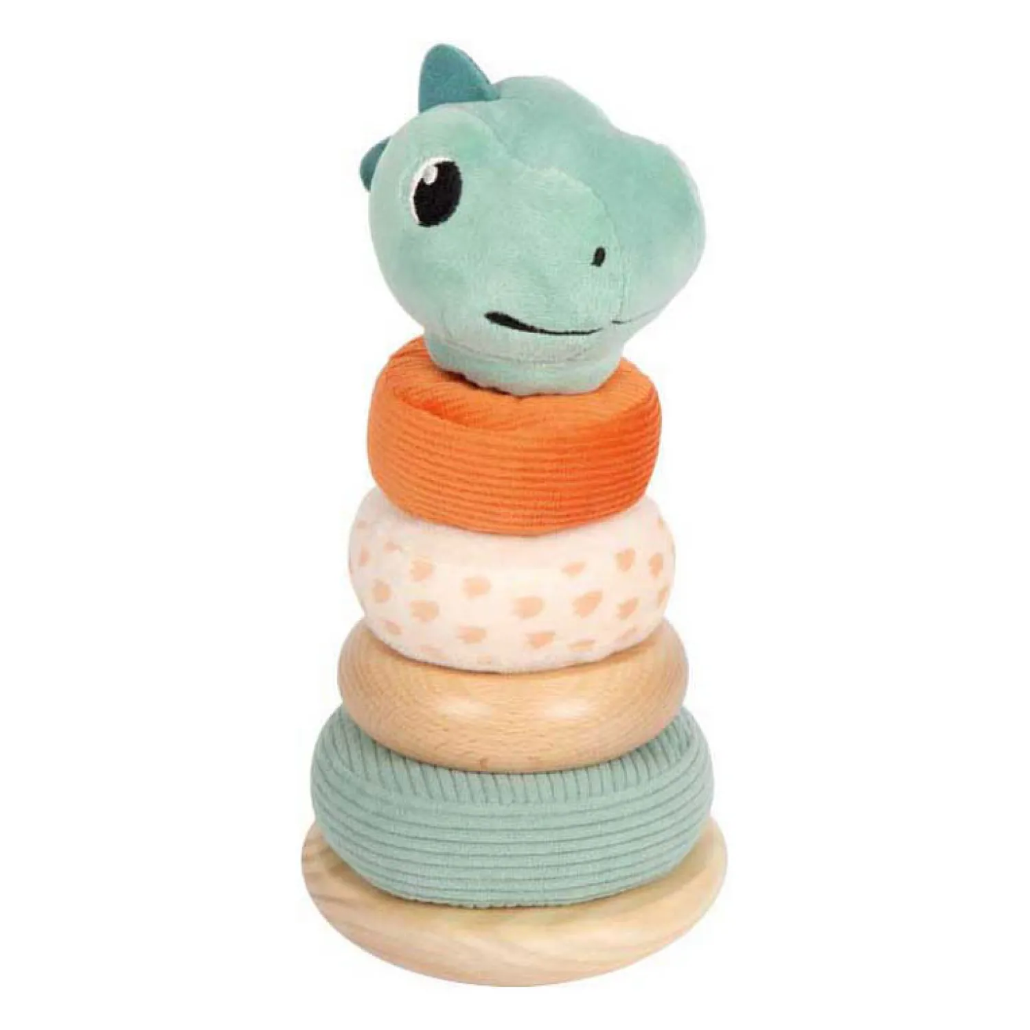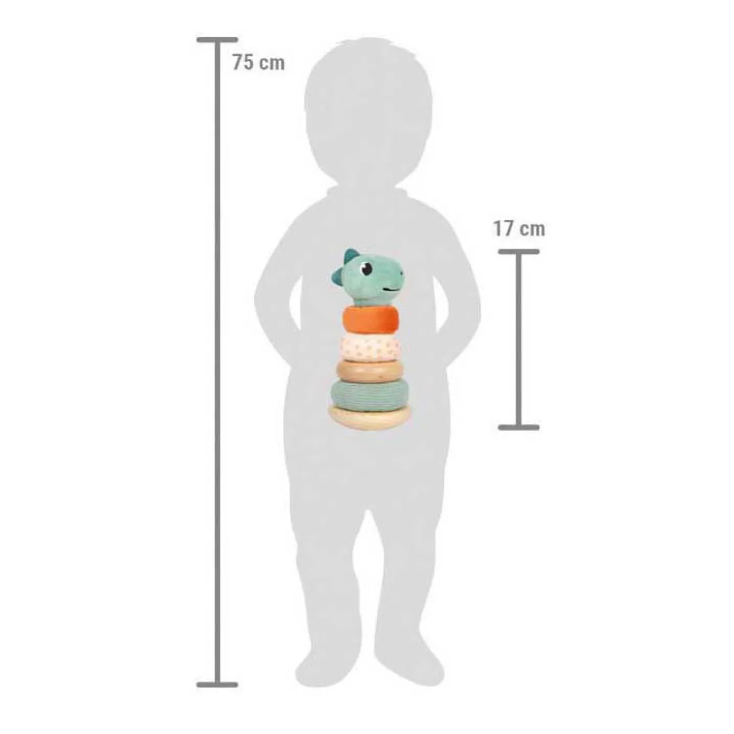 •Met vijf inzetstukken: drie zachte stoffen ringen, één houten ring en één dinosauruskop