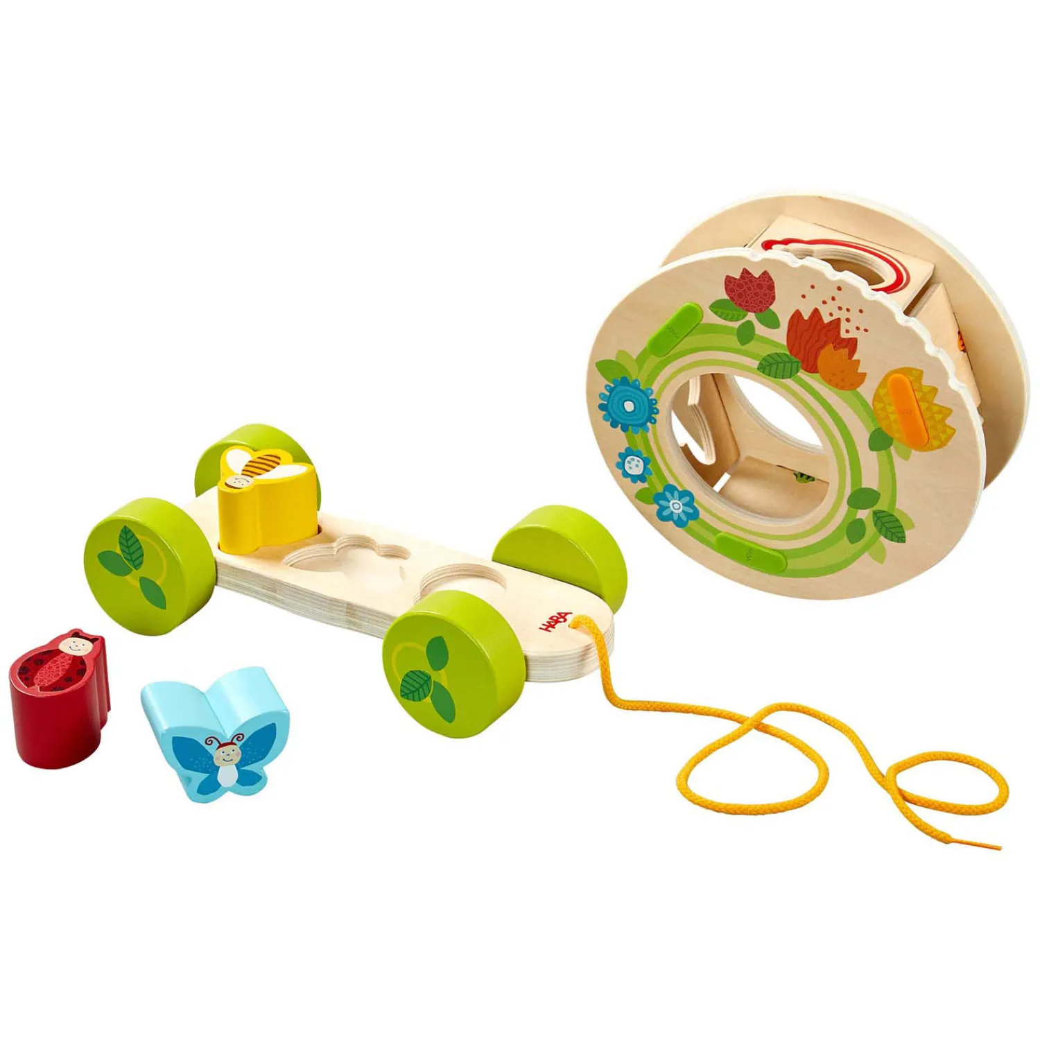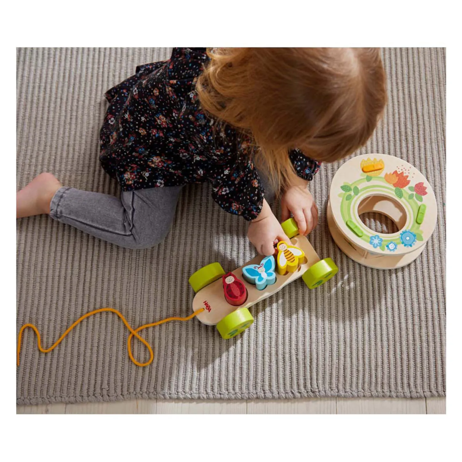 De bloemenweide staat in bloei! Als de kleurrijke sorteerbox wordt voortgetrokken, maakt hij een leuk ratelend geluid . Dat stimuleert kinderen om te kruipen en te lopen. De kleintjes kunnen de bij, het lieveheersbeestje en de vlinder al spelend in de juiste uitsparingen steken, wat hun motoriek verder ontwikkelt.