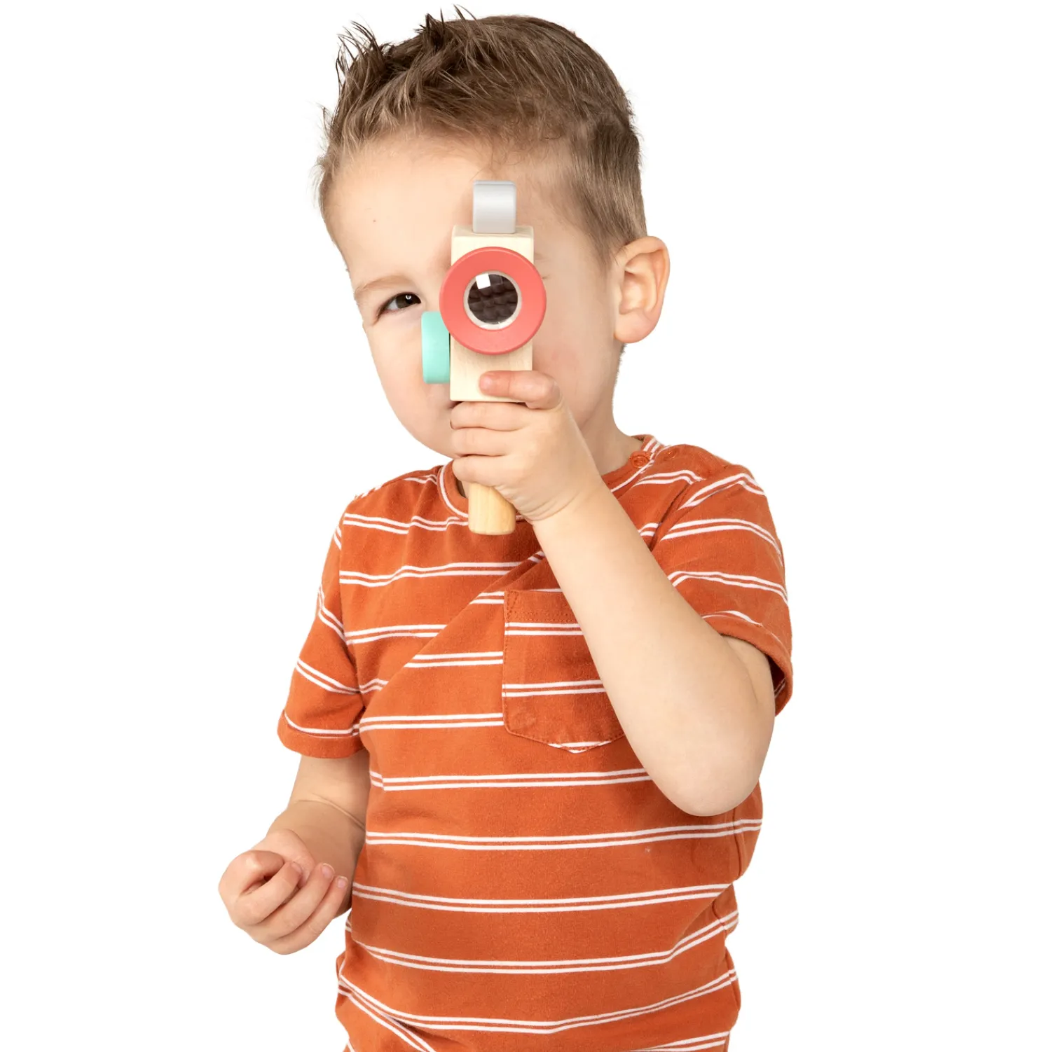 Maak je eigen video met deze ouderwetse, houten videocamera! Deze houten videorecorder heeft de look van een ouderwetse videocamera. Kijk door de lens, wat zie je? Draai aan de knop om “op te nemen”. De videocamera heeft rode, lichtblauwe en grijze accenten.