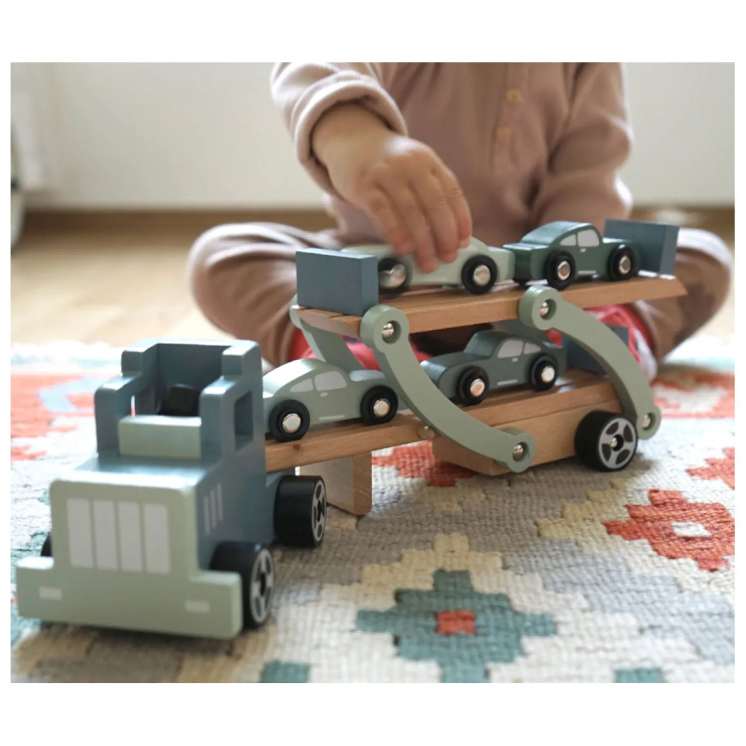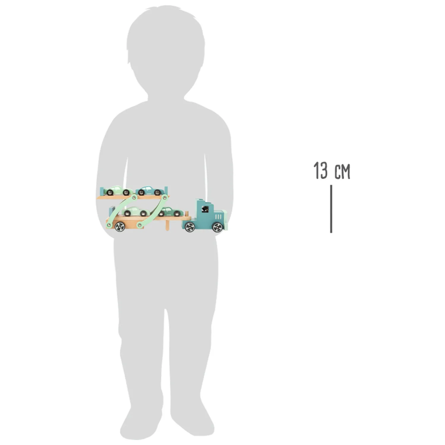 Grote wielen rijden! Deze autotransporter is gebaseerd op de grote intercontinentale vrachtwagens en inspireert met zijn “blue steel” kleurstelling. De transporter is volledig gemaakt van natuurlijk hout en zorgvuldig geglazuurd. Dit maakt het ideaal voor een langdurige game-ervaring. Twee van de vier turbosnelle sportwagens worden eenvoudig over het neerklapbare bovendek geladen en door de laadklep vastgezet. Een geweldige autotransporter die in geen enkele kinderkamer mag ontbreken.