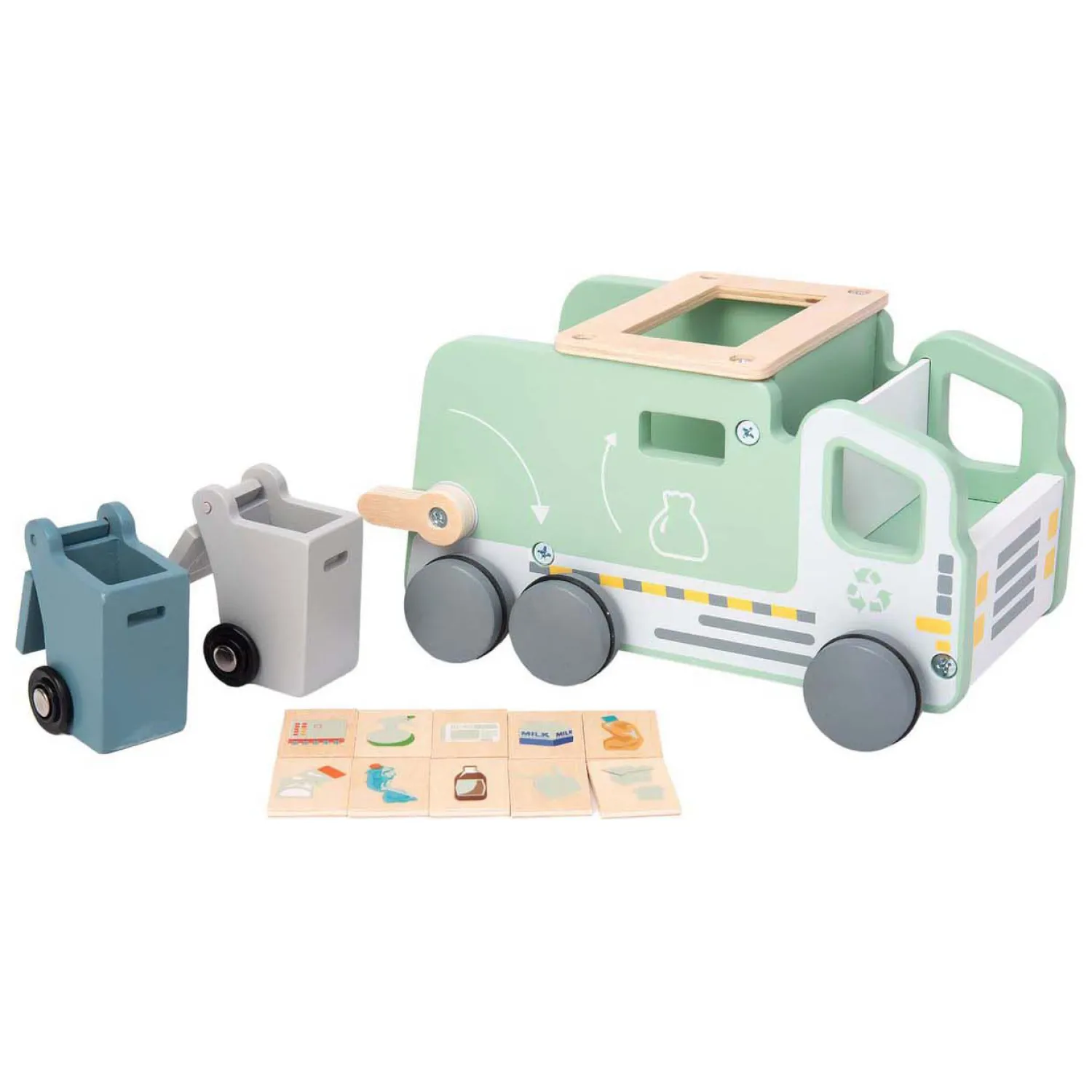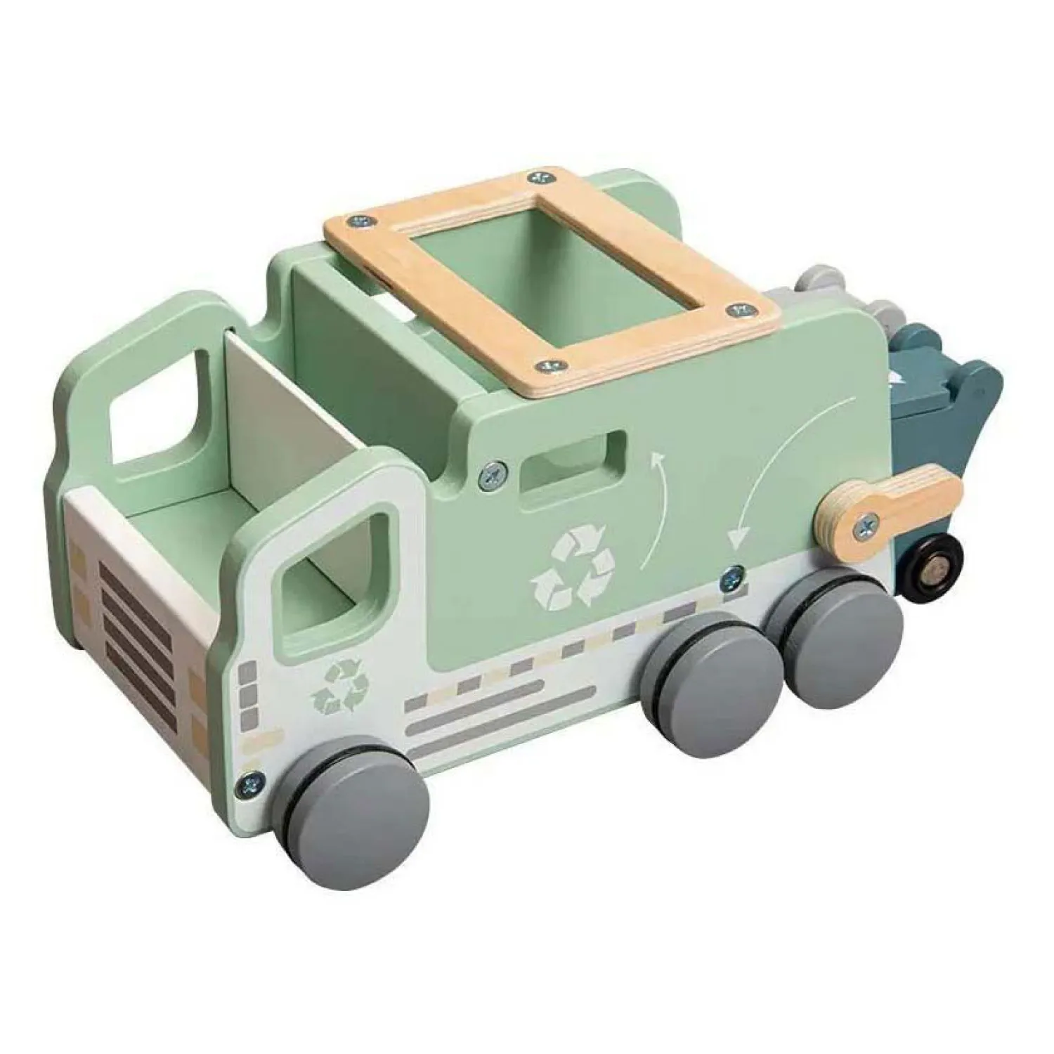 De vuilnisauto is gemaakt van hoogwaardig hout in stijlvol pastelgroen. Het laadmechanisme werkt echt door simpelweg de kliko’s aan de arm te hangen en de houten hendel over te halen.