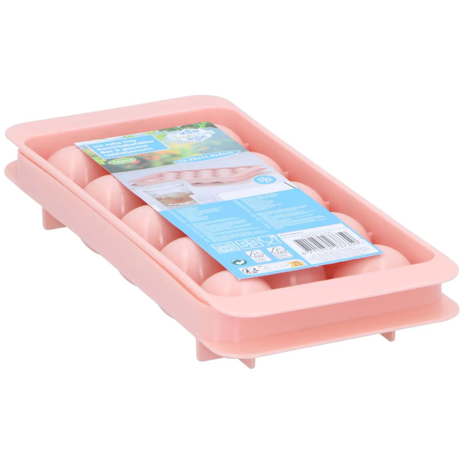 Zoek je wat verkoeling op warme dagen? Deze roze ijsblokjesmaker heeft ruimte voor 14 ronde ijsblokjes. Dankzij de deksel sluit de ijsblokjesvorm goed en blijven de ijsklontjes lekker schoon in de vriezer. De ijsblokjesvorm is 25,5 x 4 x 11,5 centimeter groot.