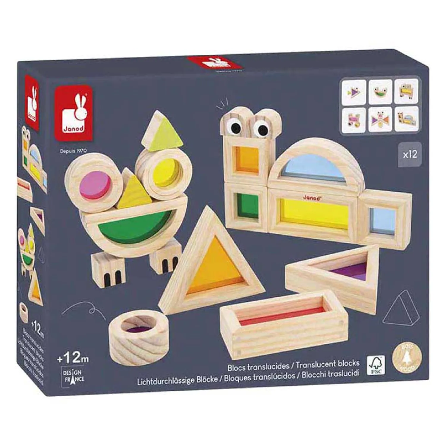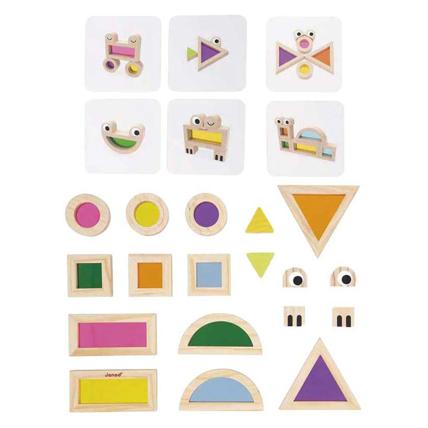 •12 transparante geometrische vormen en 6 houten blokken met dierenprints