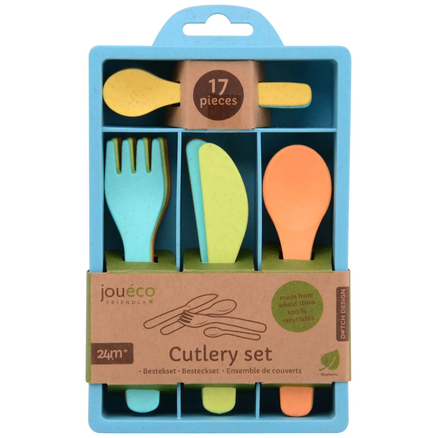 Jouéco kunststof bestekset (17-delig) gemaakt van eco kunststof van tarwevezels. 100% recyclebaar! Inhoud: vorken, messen, lepels en kleine lepels. Geschikt vanaf 24 maanden.