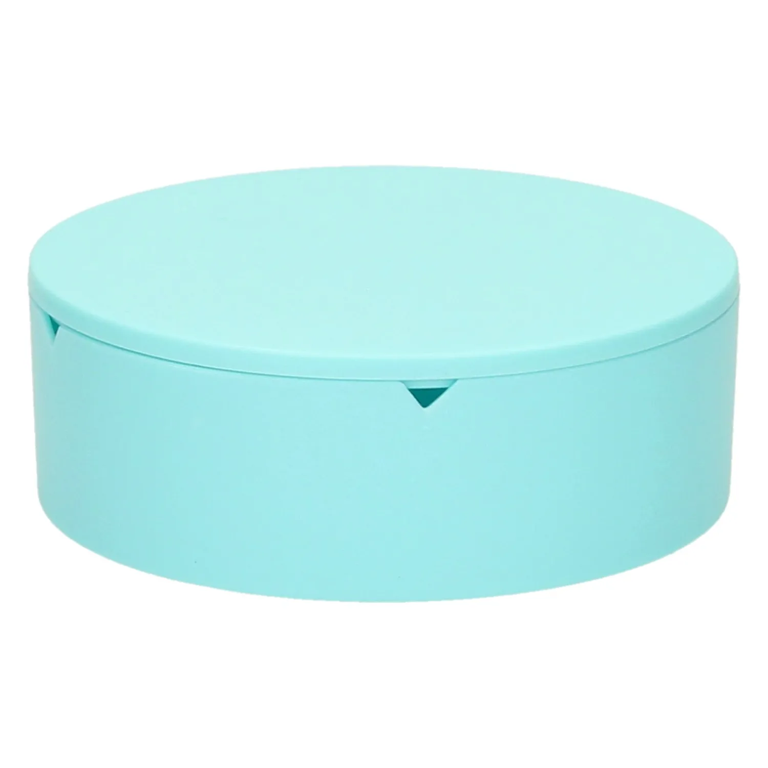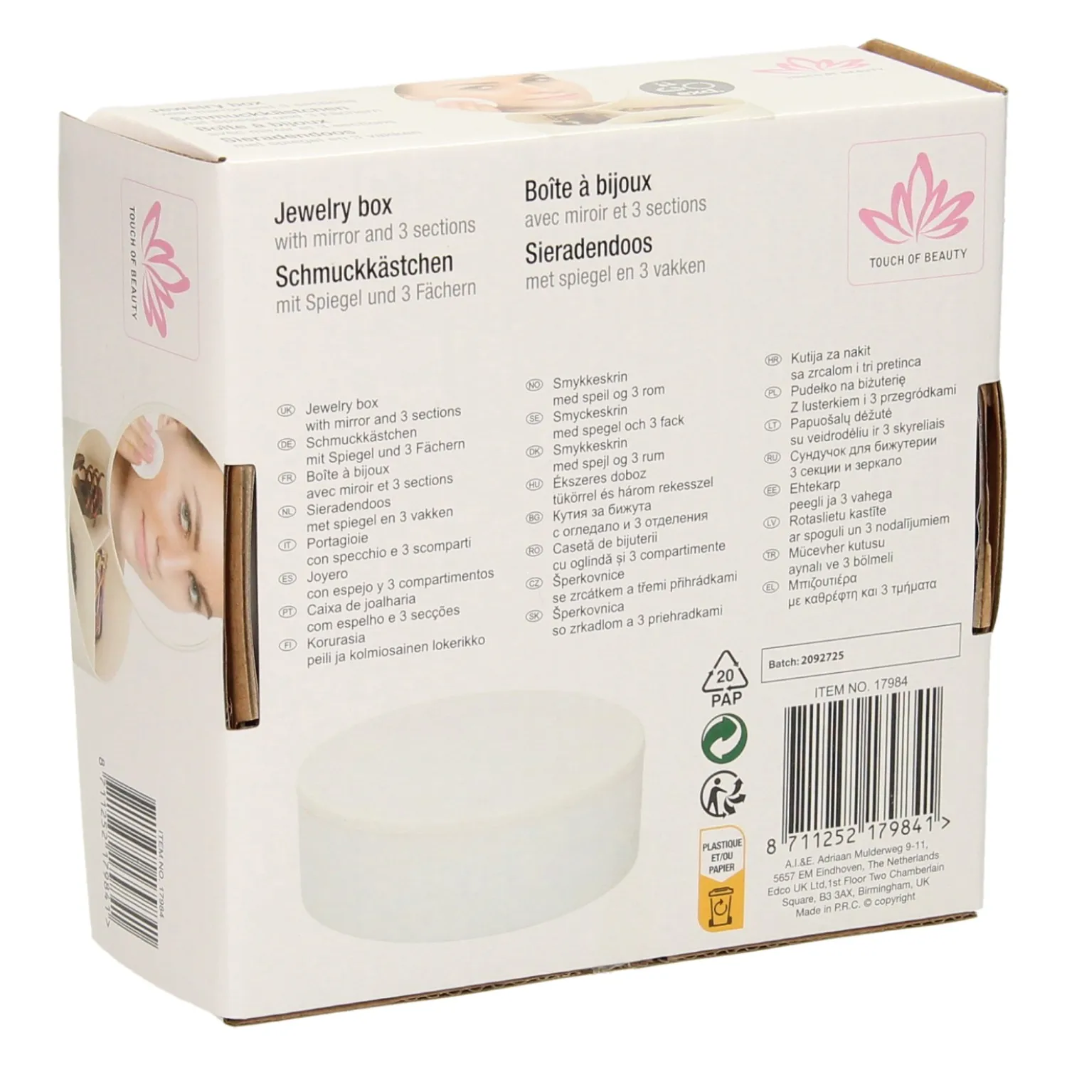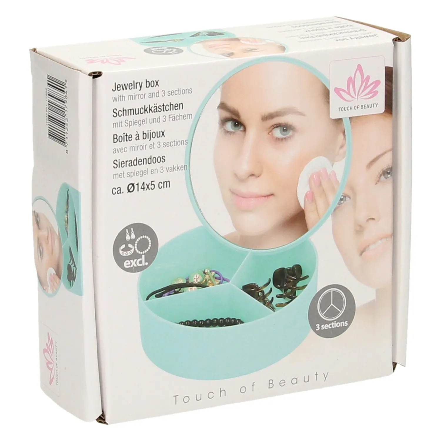 Klein kunststof opbergdoosje met 3 vakken en een spiegeltje (glas) in de deksel. Geschikt voor bijvoorbeeld kleine sieraden of make-up. Wordt geleverd in groen, blauw, roze of wit. Afmetingen: ca. 14 x 5 centimeter.Prijs per stuk, verschillende uitvoeringen/kleuren worden door elkaar geleverd.