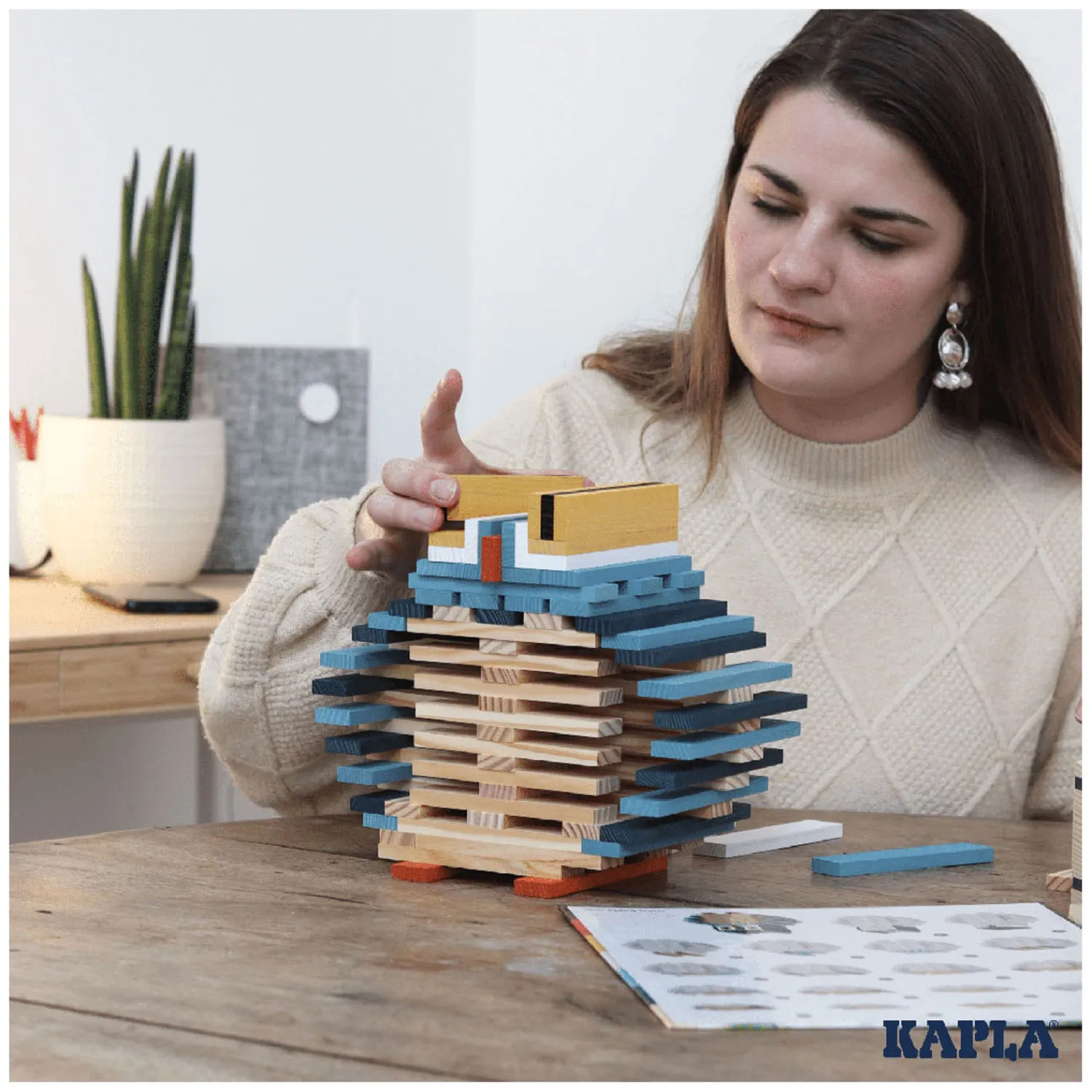 Met de KAPLA-plankjes met identieke afmetingen kan oneindig worden gespeeld en gecreëerd. De plankjes worden eenvoudigweg gestapeld, zonder lijm of bevestiging en kan je bouwen wat in je hoofd opkomt… Een KAPLA-werkje is vergankelijk van nature, en het afbreken is soms net zo prettig als het bouwen. De volgende dag ontstaan met dezelfde plankjes een nieuw universum en andere denkbeeldige structuren…