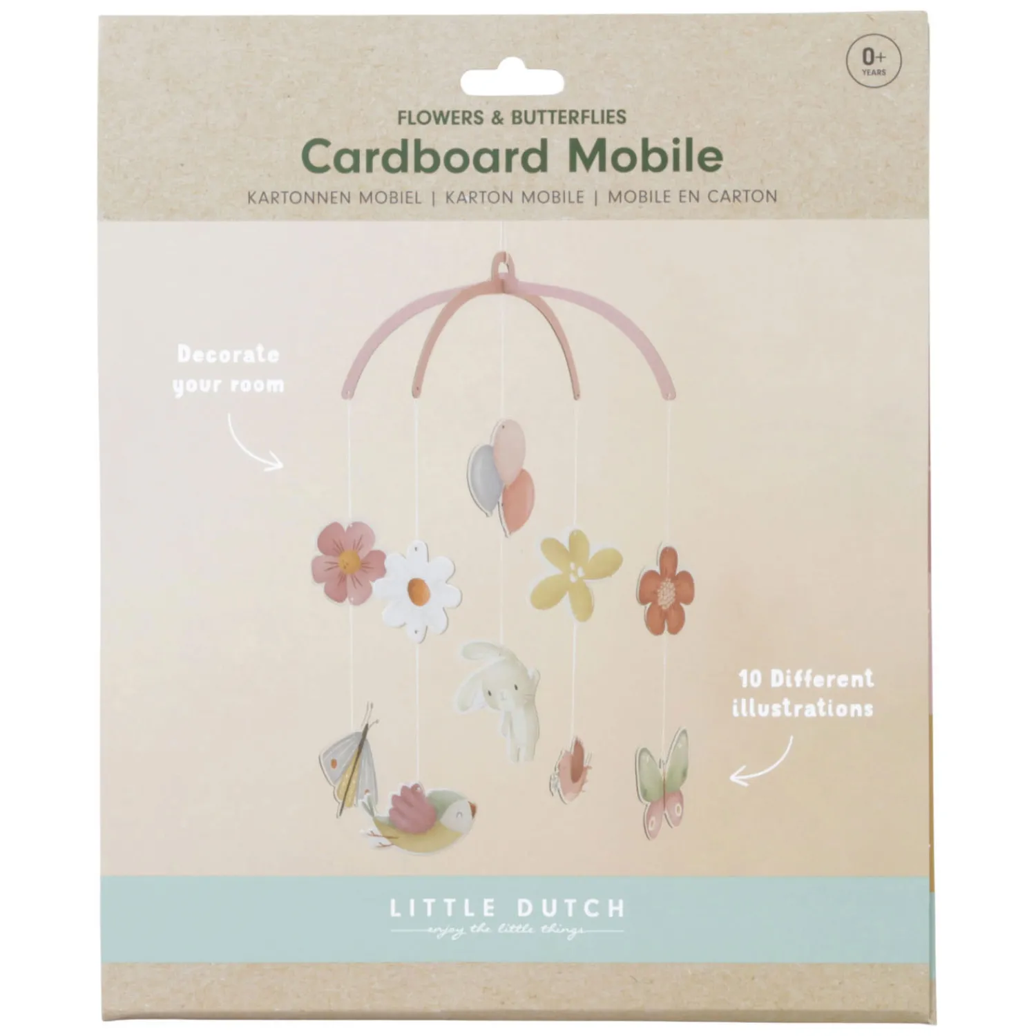 Kijk omhoog en bewonder het tafereel van Flowers & Butterflies! Zie jij de vogeltjes rondvliegen? Er is ook een vlinder bij! En heb je de balonnen gezien? Die zorgen er voor dat het konijntje naar boven zweeft. Er zijn wel 10 kartonnen figuurtjes om te ontdekken en te bewonderen. Het is niet alleen een prachtige decoratie voor de kinderkamer, maar de schattige babymobiel stimuleert ook de visuele ontwikkeling en geeft een gevoel van rust en kalmte.WAARSCHUWING: Bevestig dit speelgoed buiten bereik van het kind. Om te voorkomen dat het kind verstrikt raakt, en zich bezeert, verwijder dit speelgoed wanneer het kind op handen en voeten begint te kruipen. Te monteren door een volwassene.