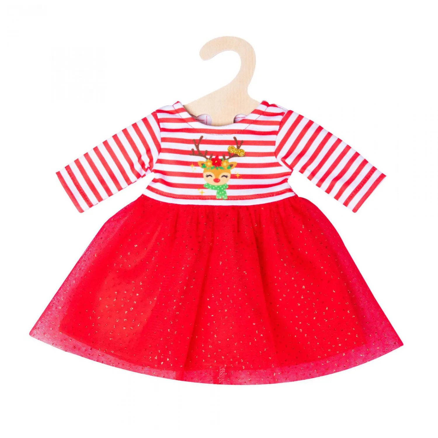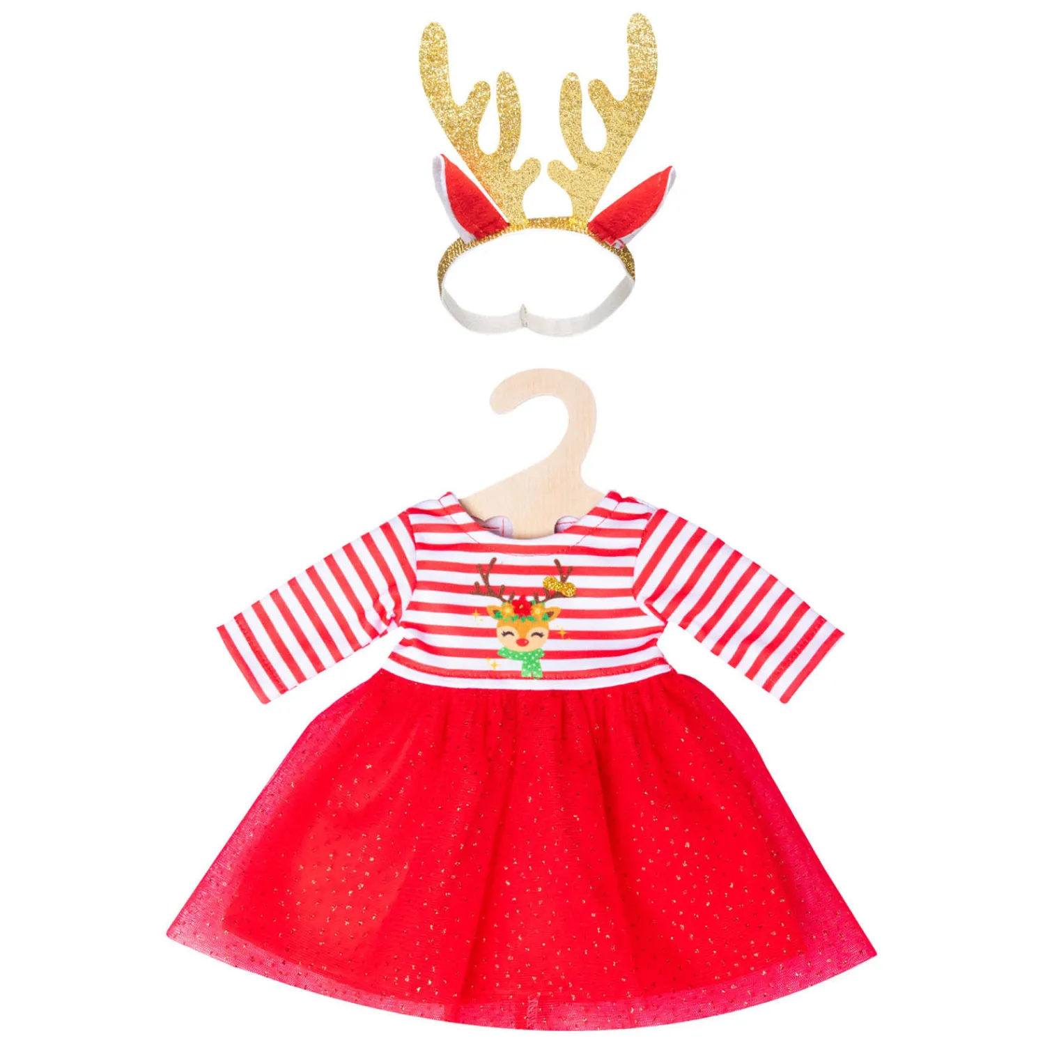De outfit wordt gecompleteerd door de rendierhoofdband met prachtig gouden gewei, die dankzij de elastische band op het hoofd van elke pop past. Deze mooie poppenoutfit is niet alleen tijdens de kerstperiode een absolute blikvanger, maar ook bij alle andere feestelijke gelegenheden. De jurk past op de meeste poppen op de markt met een lengte van 28-35 cm. Het is ook verkrijgbaar in een andere versie voor poppengrootte 35-45 cm (2151). Het artikel wordt geleverd op een houten hanger.