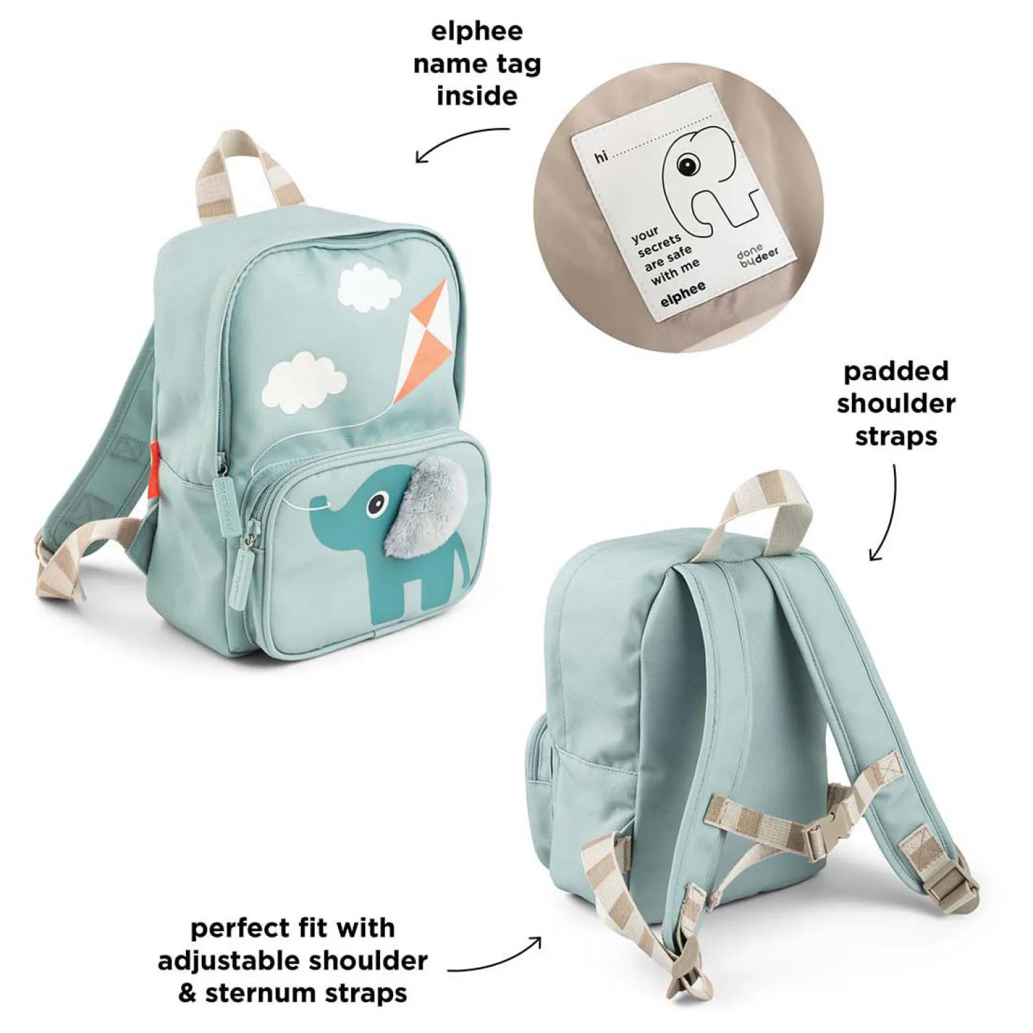 Het ruime hoofdvak is ideaal voor een broodtrommel en een flesje, terwijl het voorvak perfect is voor kleine spulletjes en kleine schatten. Binnenin houdt Elphee een oogje op de spullen van je kind met het schattige naamplaatje. Met zijn duurzame, waterbestendige oppervlak is deze rugzak klaar voor elk uitstapje of avontuur.