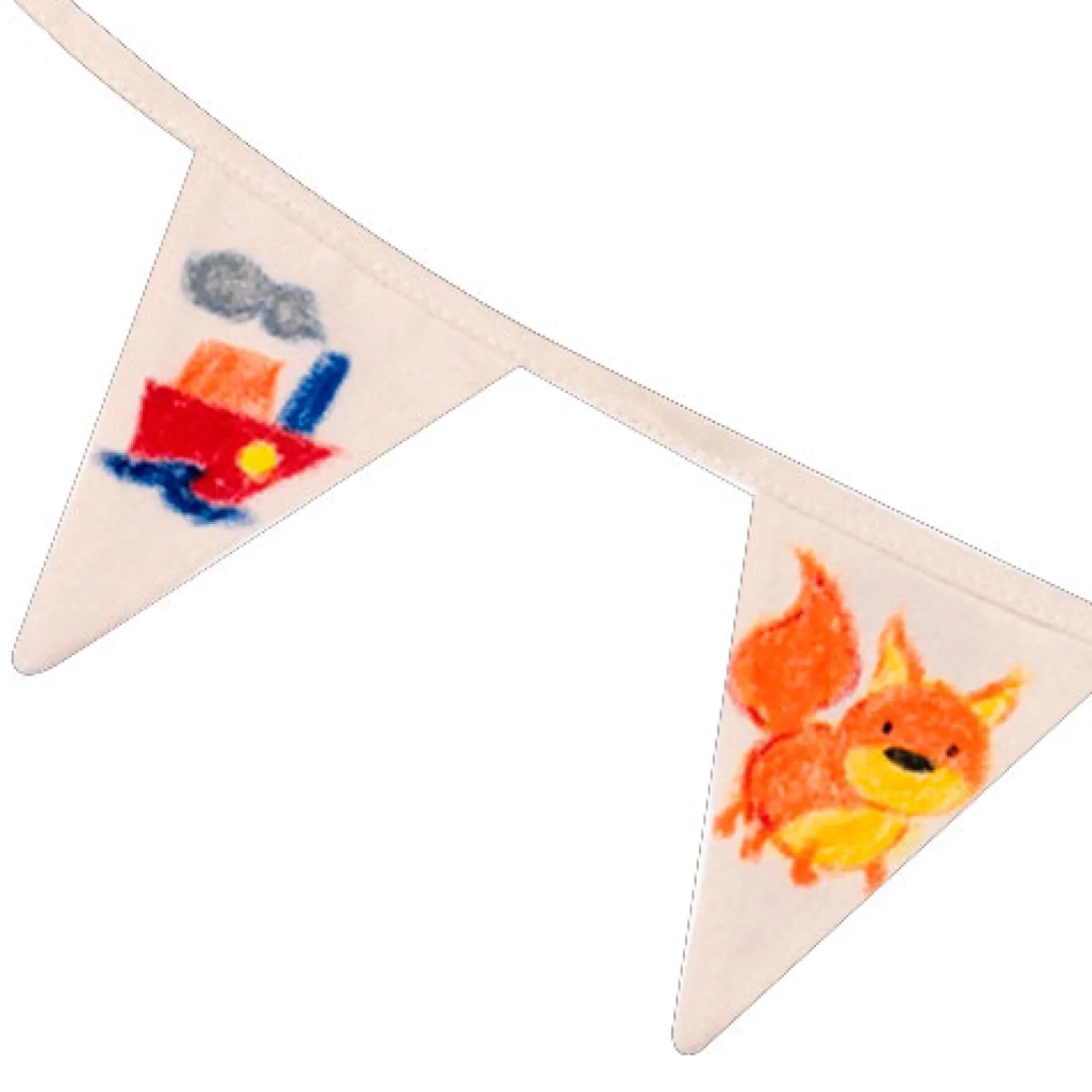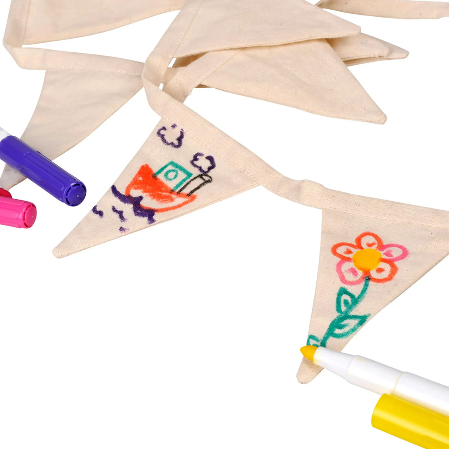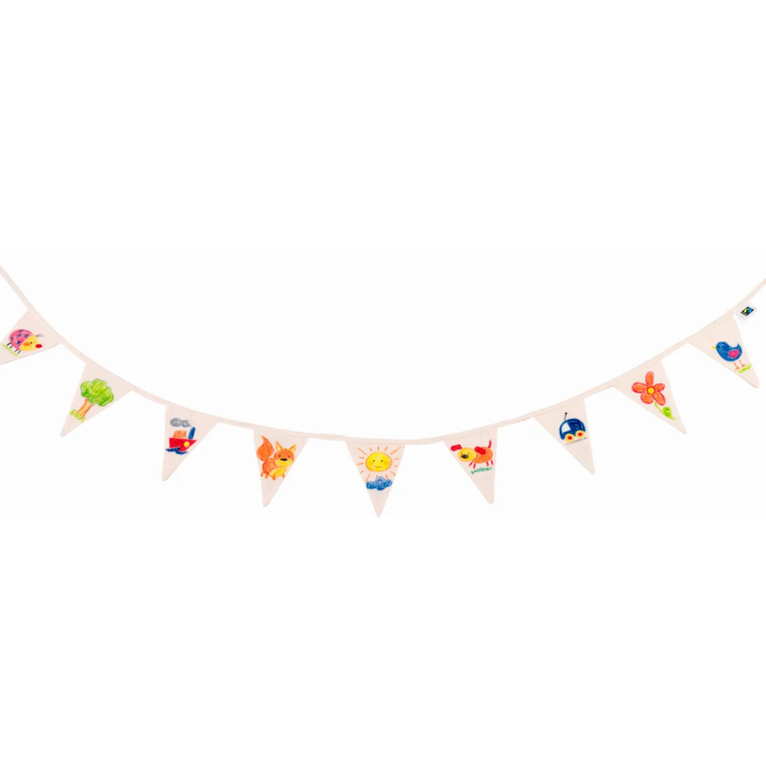 Kleur je eigen katoenen vlaggenlijn gemaakt van Fair Trade katoen uit India! Pak een stel stiften en teken je favoriete dier, eten, bloem of wat je ook maar mooi vind! De vlaggenlijn bevat 9 vlaggetjes.