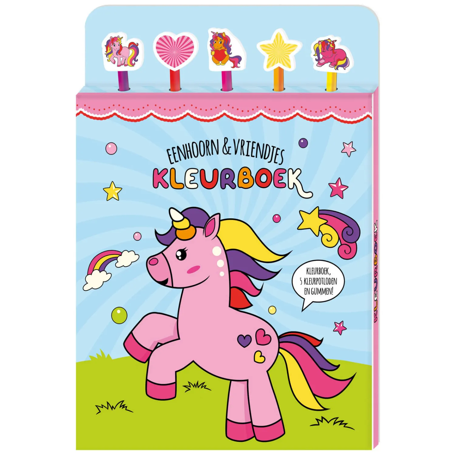 kleurboek en vijf potloden in heldere kleuren. Gebruik het gummetje aan