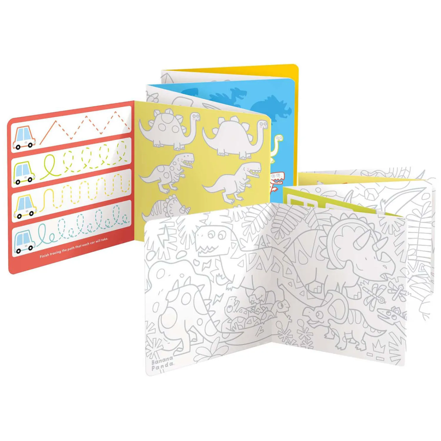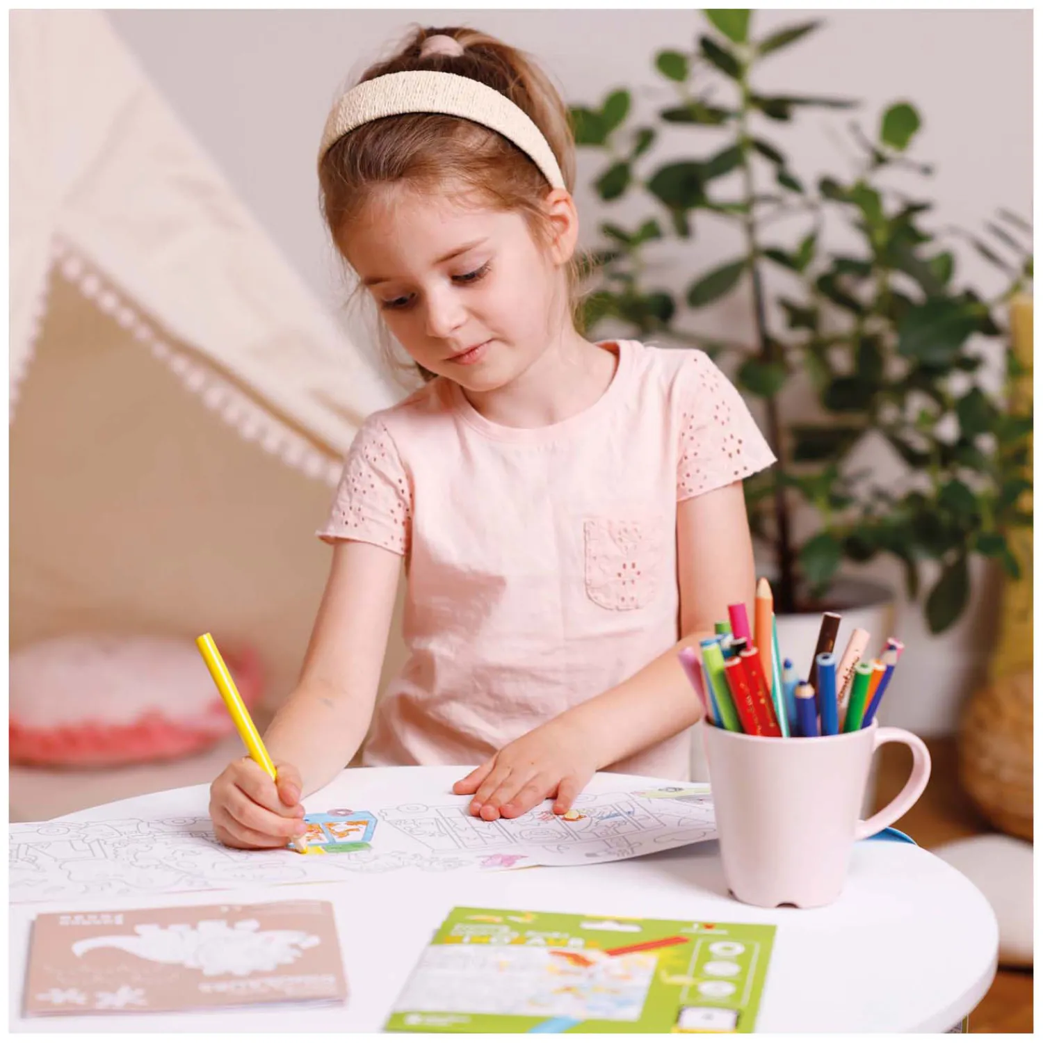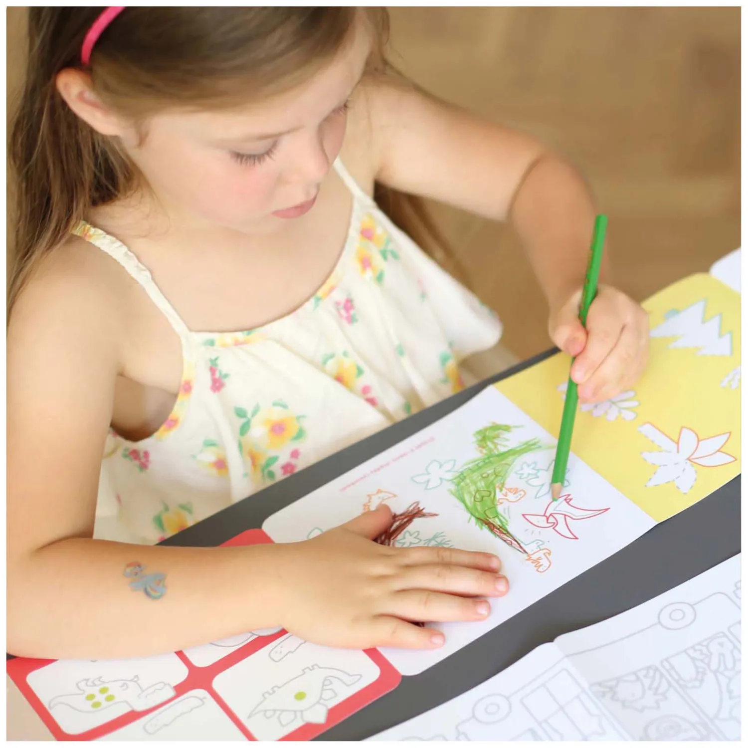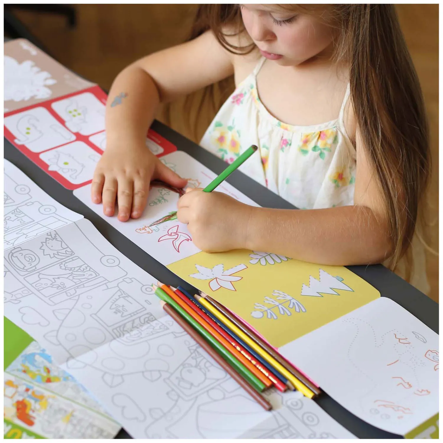 Deze creatieve set bevat 2 lange (95 cm!) accordeonboeken met 2 panoramafoto’s om in te kleuren, plus talloze creatieve en leerzame oefeningen.