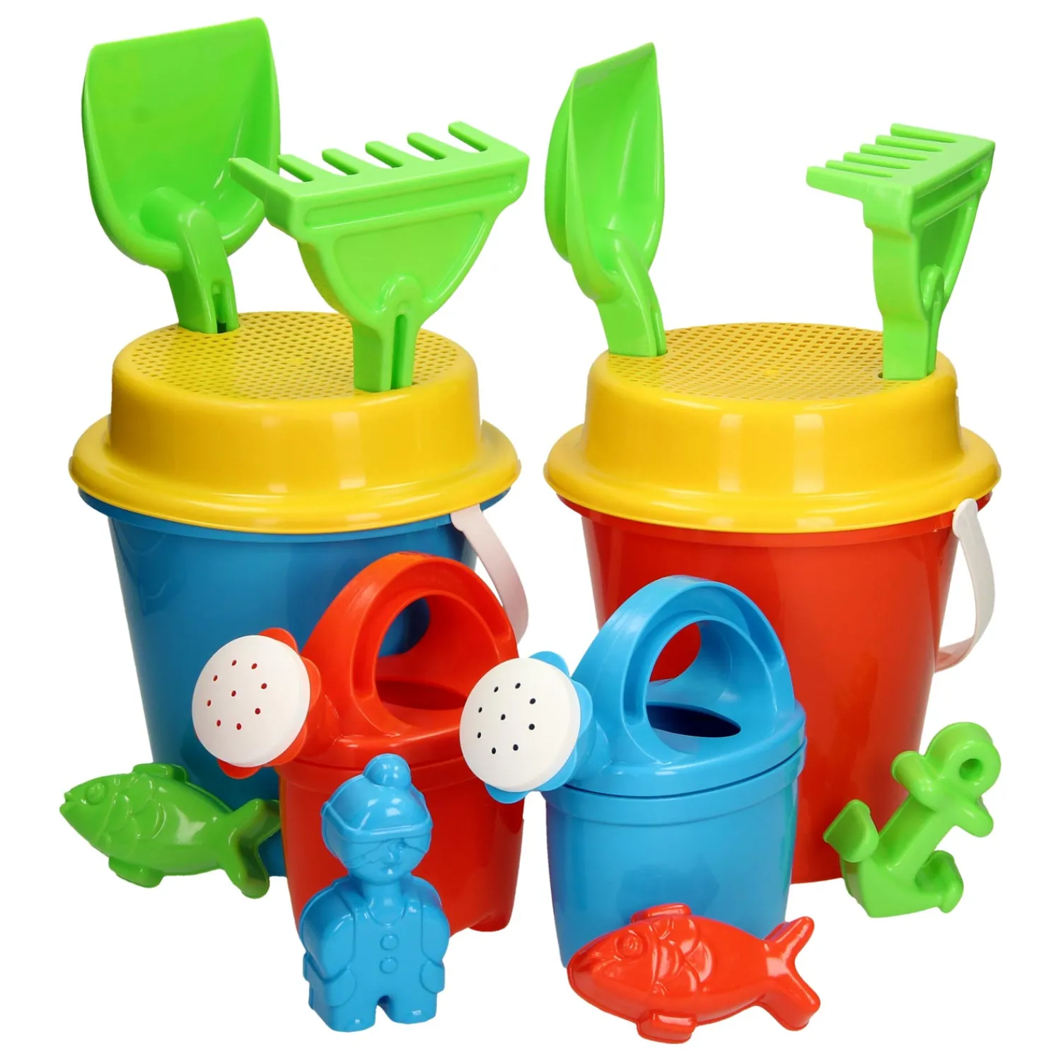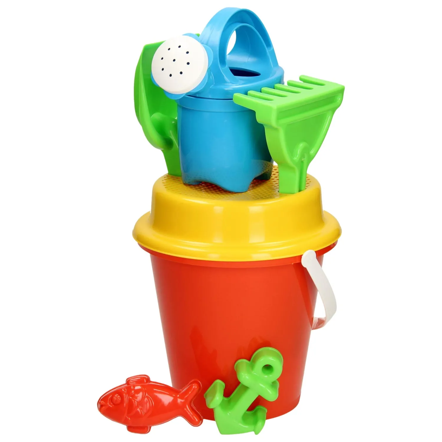 Een vrolijk gekleurde emmerset met gieter, zeef, schepje, hark, 2 zandvormen en een emmer.Prijs per stuk, verschillende uitvoeringen/kleuren worden door elkaar geleverd.