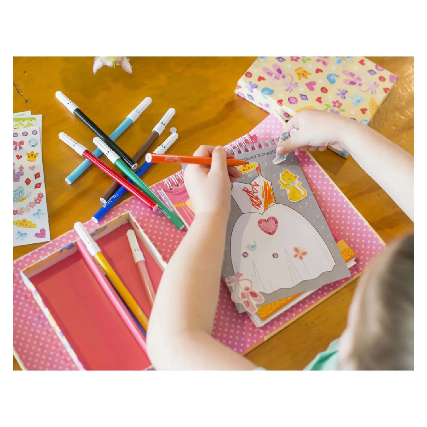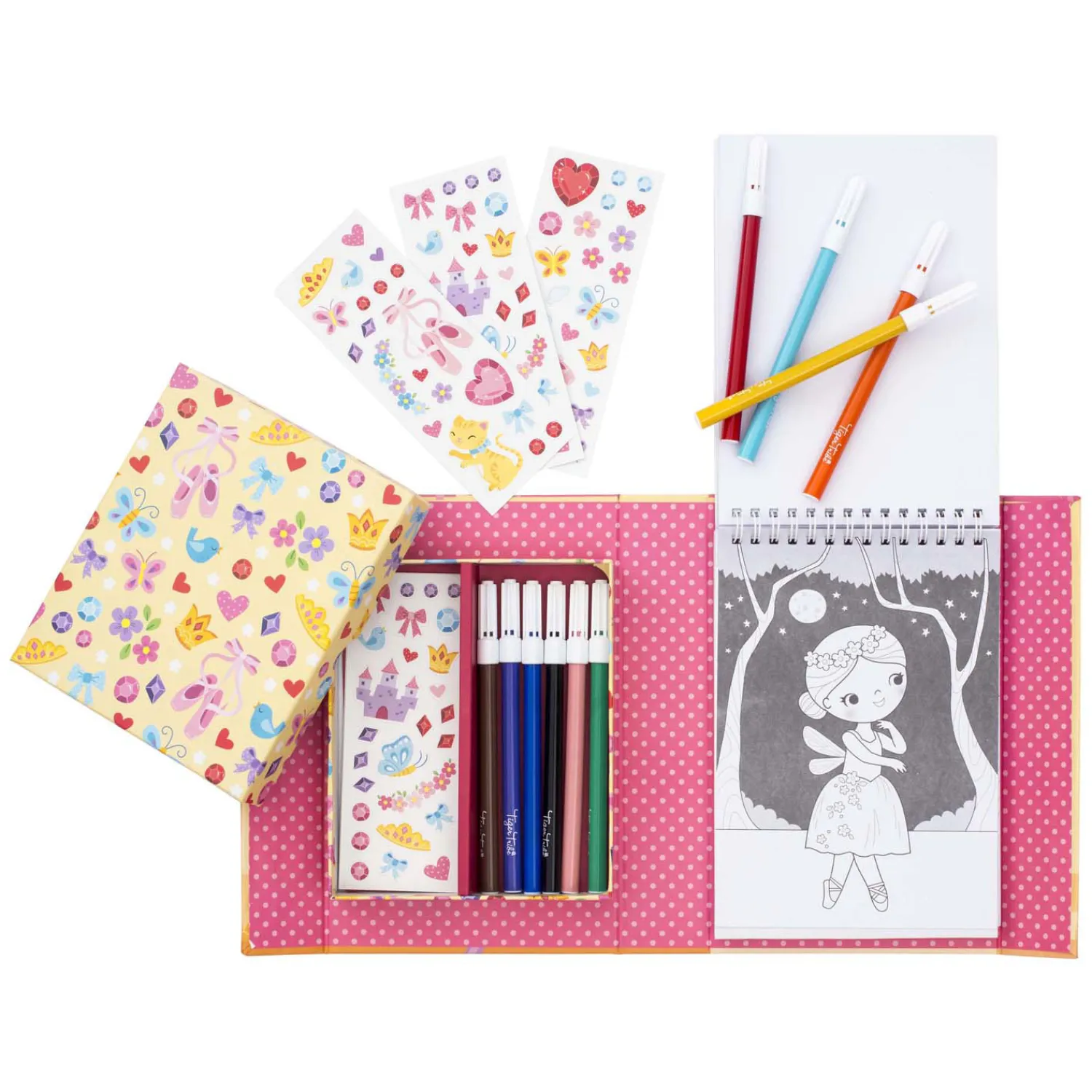 • Complete set: Bevat alles wat nodig is voor urenlang kleurplezier: stiften, stickers en kleurboekjes, allemaal handig verpakt voor creatieve uitspattingen thuis of onderweg.