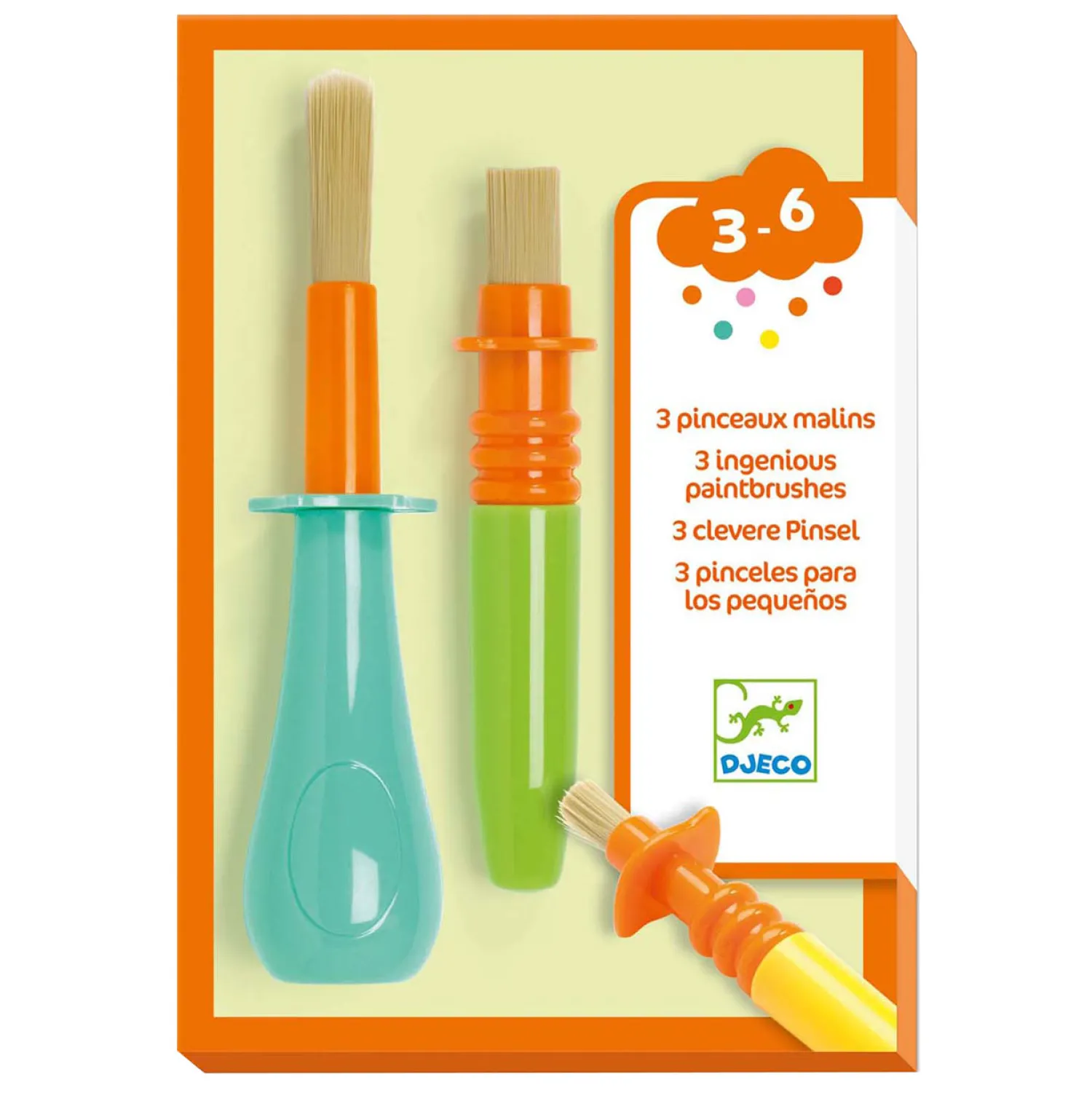 3 stevige kwasten geschikt voor kleine handen, vanaf 3 jaar. Dankzij hun rand raken ze de tafel niet en rollen ze niet weg!