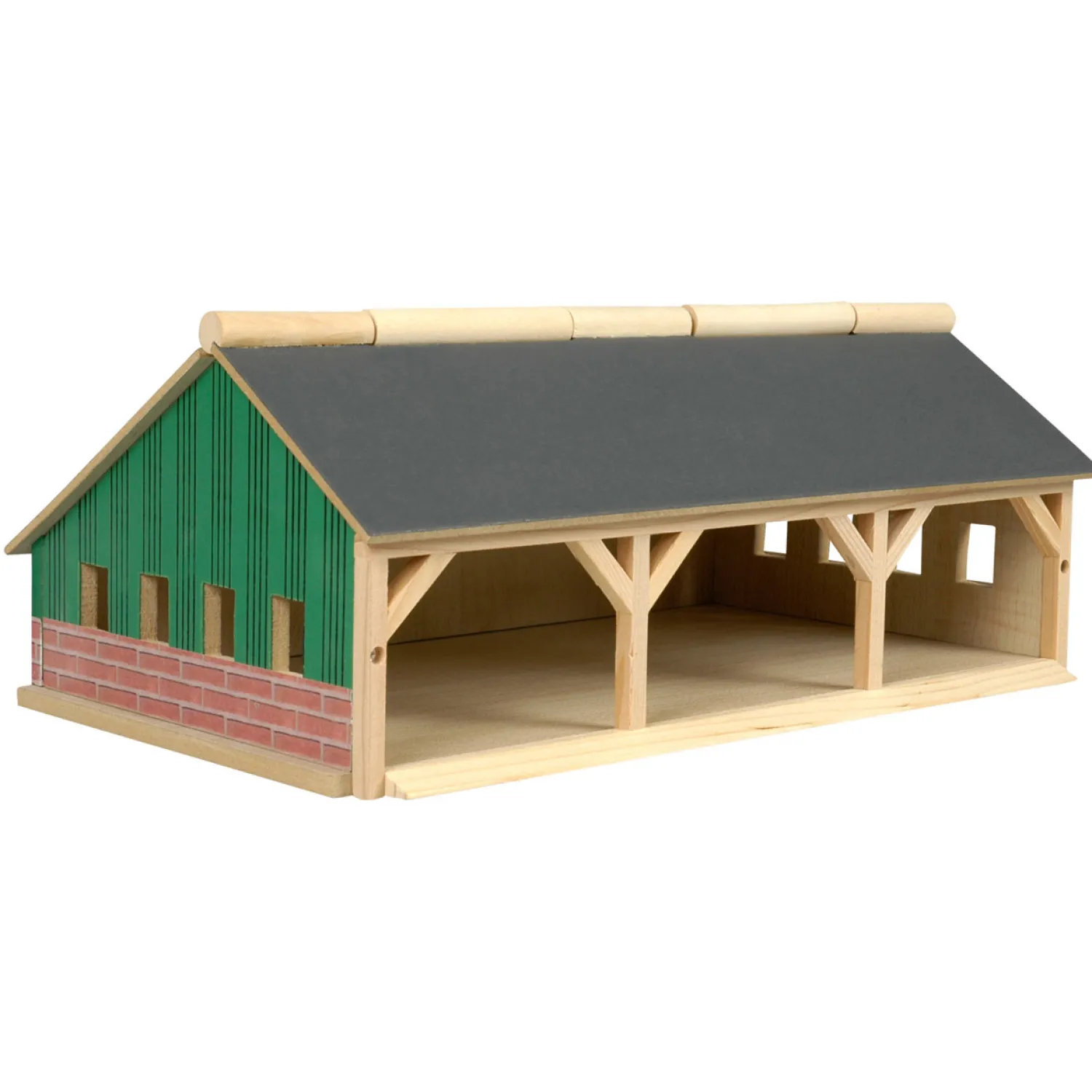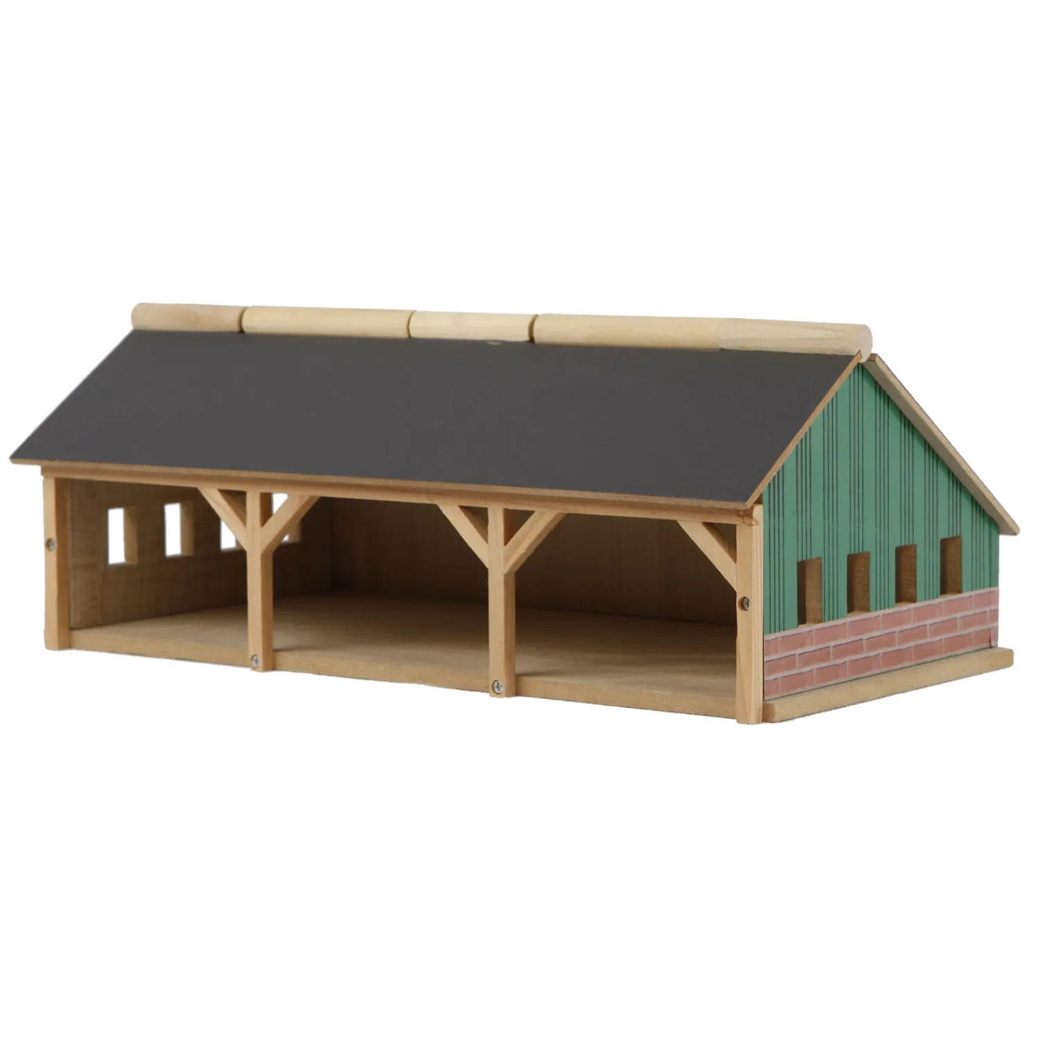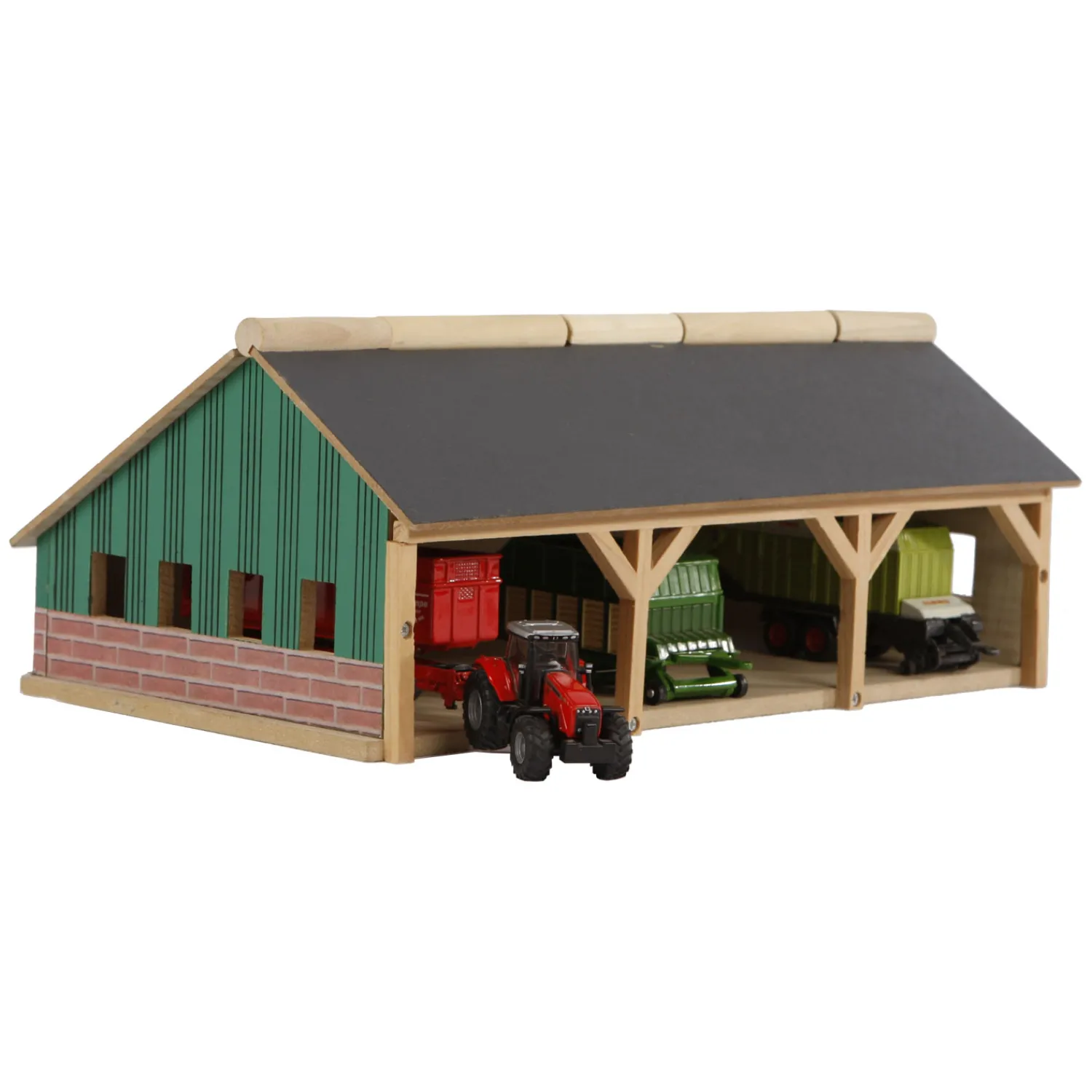 Mooie houten landbouwloods. In de loods kun je tractors en landbouwmachines stallen. Het dak kan open zodat je makkelijk met de loods kan spelen. De loods is geschikt voor de kleine Siku tractors. Schaal 1:87.