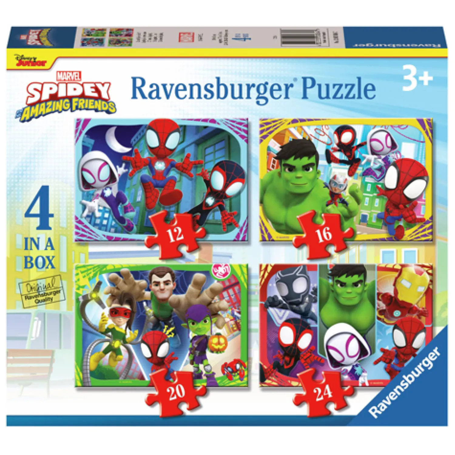 Ontsnap uit de realiteit en stap in de wereld van Ravensburger puzzels. Tijdens het puzzelen ontdekken kinderen hun grootse vaardigheden. Maak wel 4 verschillende puzzels met de speciale puzzle box van Ravensburger! Dankzij de met de hand gemaakte stansmessen is de vormvariatie van de stukjes oneindig. Kinderen vanaf 3 jaar zullen genieten van de Spidey and his Amazing Friends puzzels met 12, 16, 20, 24 stukjes.