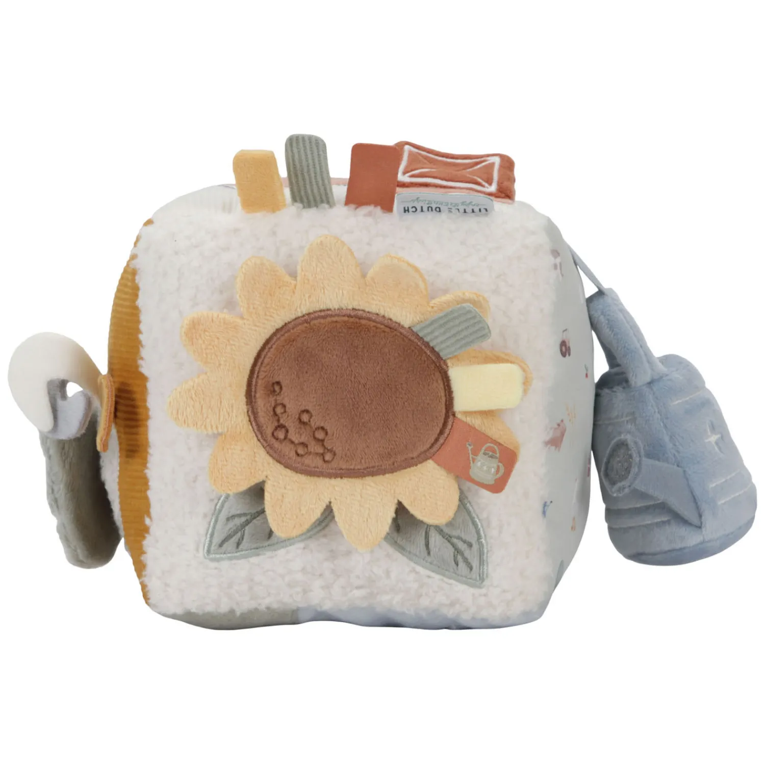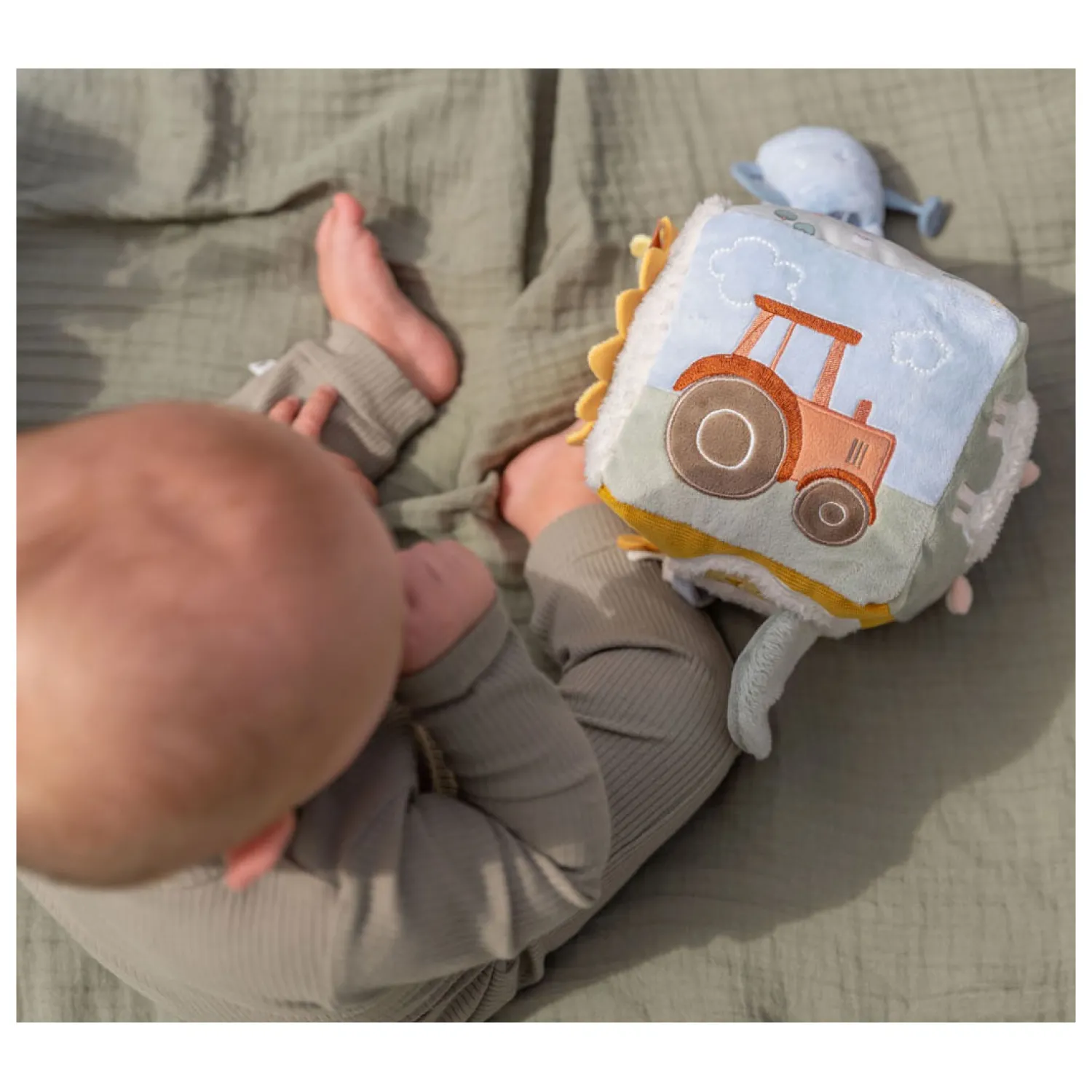 Op avontuur op de boerderij. Deze superzachte activiteitenkubus in zachte tinten wekt de nieuwsgierigheid van jouw kleintje zeker. Elke zijde is voorzien van een andere activiteit met verschillende texturen en vormen die helpen bij het ontwikkelen van de zintuigen en natuurlijk voor eindeloos veel entertainment zorgen. De kubus kan vastgepakt en gedraaid worden en beschikt over een spiegeltje voor zelfontdekking.
